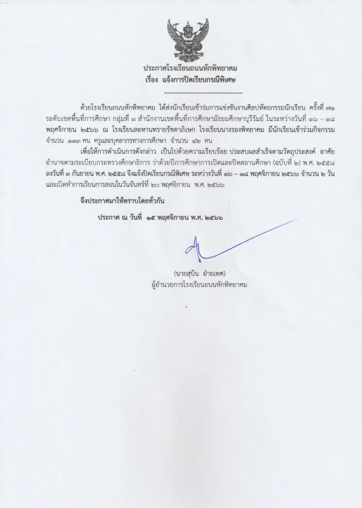 เพื่อให้การดำเนินการดังกล่าว เป็นไปด้วยความเรียบร้อย ประสบผลสำเร็จตามวัตถุประสงค์ อาศัยอำนาจตามระเบียบกระทรวงศึกษาธิการ ว่าด้วยการศึกษาการเปิดและปิดสถานศึกษา (ฉบับที่ ๒) พ.ศ. ๒๕๕๘ ลงวันที่ ๓ กันยายน พ.ศ. ๒๕๕๘ จึงแจ้งปิดเรียนกรณีพิเศษ ระหว่างวันที่ ๑๖ – ๑๘ พฤศจิกายน ๒๕๖๖ จำนวน ๒ วัน และเปิดทำการเรียนการสอนในวันจันทร์ที่ ๒๐ พฤศจิกายน พ.ศ. ๒๕๖๖