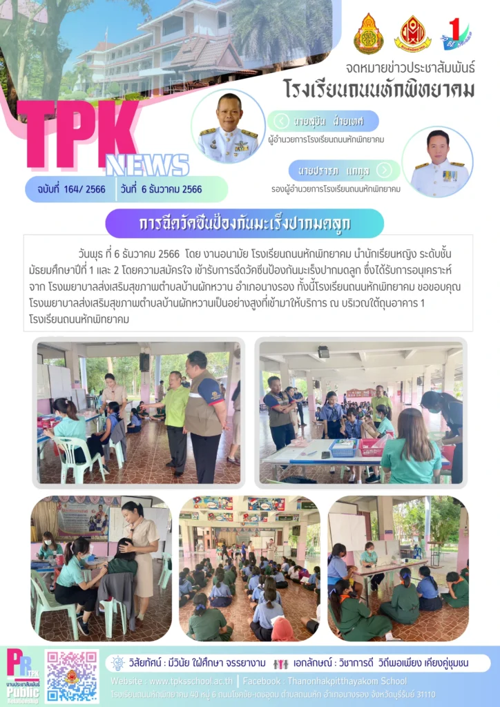 การฉีดวัคซีนป้องกันมะเร็งปากมดลูก ม.1 และ ม.2By Sirinun S / December 12, 2023 วันพุธ ที่ 6 ธันวาคม 2566 โดย งานอนามัย โรงเรียนถนนหักพิทยาคม นำนักเรียนหญิง ระดับชั้นมัธยมศึกษาปีที่ 1 และ 2 โดยความสมัครใจ เข้ารับการฉีดวัคซีนป้องกันมะเร็งปากมดลูก ซึ่งได้รับการอนุเคราะห์ จาก โรงพยาบาลส่งเสริมสุขภาพตำบลบ้านผักหวาน อำเภอนางรอง ทั้งนี้โรงเรียนถนนหักพิทยาคม ขอขอบคุณโรงพยาบาลส่งเสริมสุขภาพตำบลบ้านผักหวานเป็นอย่างสูงที่เข้ามาให้บริการ ณ บริเวณใต้ถุนอาคาร 1 โรงเรียนถนนหักพิทยาคม📑 ข้อมูลโดย : งานอนามัย โรงเรียนถนนหักพิทยาคม🎬 ข่าวสารโดย : งานประชาสัมพันธ์ 🖼️ รูปภาพเพิ่มเติม :
