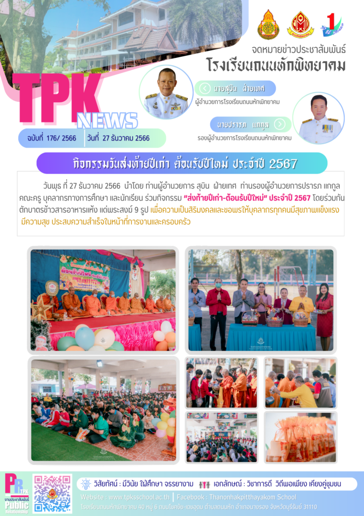 กิจกรรมวันส่งท้ายปีเก่า ต้อนรับปีใหม่ ประจำปี 2567By Sirinun S / January 3, 2024 วันพุธ ที่ 27 ธันวาคม 2566 นำโดย ท่านผู้อำนวยการ สุบิน ฝ่ายเทศ ท่านรองผู้อำนวยการปรารภ แกกูล คณะครู บุคลากรทางการศึกษา และนักเรียน ร่วมกิจกรรม “ส่งท้ายปีเก่า-ต้อนรับปีใหม่” ประจำปี 2567 โดยร่วมกันตักบาตรข้าวสารอาหารแห้ง แด่พระสงฆ์ 9 รูป เพื่อความเป็นสิริมงคลและขอพรให้บุคลากรทุกคนมีสุขภาพแข็งแรงมีความสุข ประสบความสำเร็จในหน้าที่การงานและครอบครัว📑 ข้อมูลโดย : กลุ่มสาระการเรียนรู้สังคมศึกษา ศาสนา และวัฒนธรรม โรงเรียนถนนหักพิทยาคม🎬 ข่าวสารโดย : งานประชาสัมพันธ์ 🖼️ รูปภาพเพิ่มเติม :