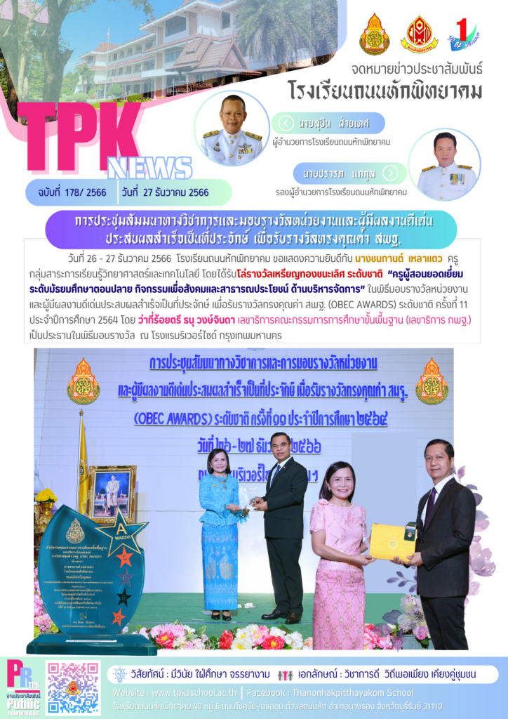วันที่ 26 – 27 ธันวาคม 2566 โรงเรียนถนนหักพิทยาคม ขอแสดงความยินดีกับ นางชนกานต์ เหลาแตว ครู กลุ่มสาระการเรียนรู้วิทยาศาสตร์และเทคโนโลยี โดยได้รับโล่รางวัลเหรียญทองชนะเลิศ ระดับชาติ “ครูผู้สอนยอดเยี่ยม ระดับมัธยมศึกษาตอนปลาย กิจกรรมเพื่อสังคมและสาธารณประโยชน์ ด้านบริหารจัดการ“ ในพิธีมอบรางวัลหน่วยงานและผู้มีผลงานดีเด่นประสบผลสำเร็จเป็นที่ประจักษ์ เพื่อรับรางวัลทรงคุณค่า สพฐ. (OBEC AWARDS) ระดับชาติ ครั้งที่ 11 ประจำปีการศึกษา 2564 โดย ว่าที่ร้อยตรี ธนุ วงษ์จินดา เลขาธิการคณะกรรมการการศึกษาขั้นพื้นฐาน (เลขาธิการ กพฐ.) เป็นประธานในพิธีมอบรางวัล ณ โรงแรมริเวอร์ไซด์ กรุงเทพมหานคร
