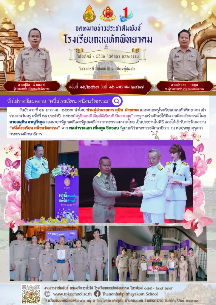 วันอังคาร ที่ ๑๖ มกราคม ๒๕๖๗ นำโดย ท่านผู้อำนวยการ สุบิน ฝ่ายเทศ และคณะครูโรงเรียนถนนหักพิทยาคม เข้าร่วมงานวันครู ครั้งที่ ๖๘ ประจำปี ๒๕๖๗“ครูดีสอนดี ศิษย์ดีเรียนดี มีความสุข” วางฐานสร้างศิษย์ให้มีความคิดสร้างสรรค์ โดยนายอนุทิน ชาญวีรกูล รองนายกรัฐมนตรีและรัฐมนตรีว่าการกระทรวงมหาดไทย เป็นประธานในพิธี และได้เข้ารับรางวัลผลงาน “หนึ่งโรงเรียน หนึ่งนวัตกรรม” จาก พลตำรวจเอก เพิ่มพูน ชิดชอบ รัฐมนตรีว่ากระทรวงศึกษาธิการ ณ หอประชุมคุรุสภา กระทรวงศึกษาธิการ
