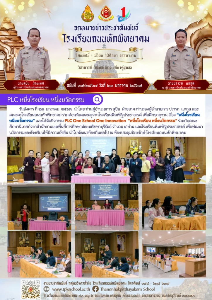 วันอังคาร ที่ ๒๓ มกราคม ๒๕๖๗ นำโดย ท่านผู้อำนวยการ สุบิน ฝ่ายเทศ ท่านรองผู้อำนวยการ ปรารภ แกกูล และคณะครูโรงเรียนถนนหักพิทยาคม ร่วมต้อนรับคณะครูจากโรงเรียนพิมพ์รัฐประชาสรรค์ เพื่อศึกษาดูงาน เรื่อง “หนึ่งโรงเรียน หนึ่งนวัตกรรม” และได้จัดกิจกรรม PLC One School One Innovation “หนึ่งโรงเรียน หนึ่งนวัตกรรม” ร่วมกับคณะศึกษานิเทศก์จากสำนักงานเขตพื้นที่การศึกษามัธยมศึกษาบุรีรัมย์ จำนวน ๔ ท่าน และโรงเรียนพิมพ์รัฐประชาสรรค์ เพื่อพัฒนา นวัตกรรมของโรงเรียนให้มีความยั่งยืน นำไปพัฒนาท้องถิ่นต่อไป ณ ห้องประชุมปิยะรักษ์ โรงเรียนถนนหักพิทยาคม