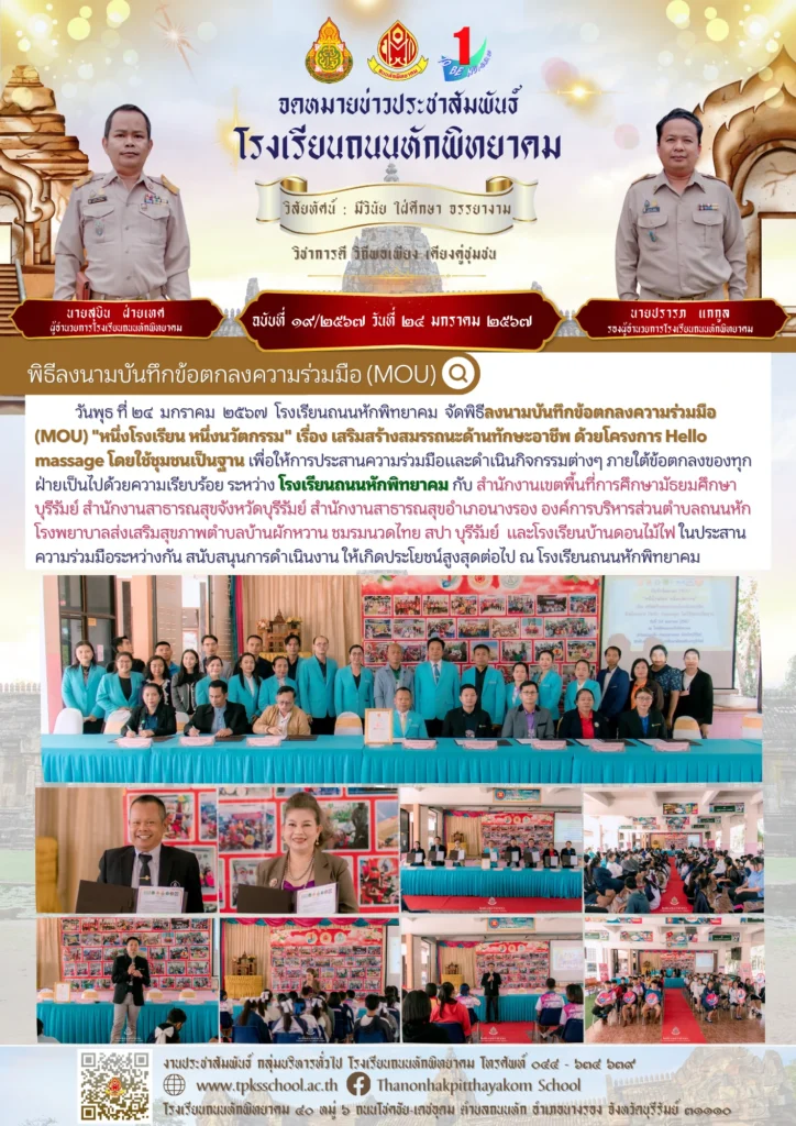 วันพุธ ที่ ๒๔ มกราคม ๒๕๖๗ โรงเรียนถนนหักพิทยาคม จัดพิธีลงนามบันทึกข้อตกลงความร่วมมือ (MOU) “หนึ่งโรงเรียน หนึ่งนวัตกรรม” เรื่อง เสริมสร้างสมรรถนะด้านทักษะอาชีพ ด้วยโครงการ Hello massage โดยใช้ชุมชนเป็นฐาน เพื่อให้การประสานความร่วมมือและดำเนินกิจกรรมต่างๆ ภายใต้ข้อตกลงของทุกฝ่ายเป็นไปด้วยความเรียบร้อย ระหว่าง โรงเรียนถนนหักพิทยาคม กับ สำนักงานเขตพื้นที่การศึกษามัธยมศึกษาบุรีรัมย์ สำนักงานสาธารณสุขจังหวัดบุรีรัมย์ สำนักงานสาธารณสุขอำเภอนางรอง องค์การบริหารส่วนตำบลถนนหักโรงพยาบาลส่งเสริมสุขภาพตำบลบ้านผักหวาน ชมรมนวดไทย สปา บุรีรัมย์ และโรงเรียนบ้านดอนไม้ไฟ ในประสานความร่วมมือระหว่างกัน สนับสนุนการดำเนินงาน ให้เกิดประโยชน์สูงสุดต่อไป ณ โรงเรียนถนนหักพิทยาคม