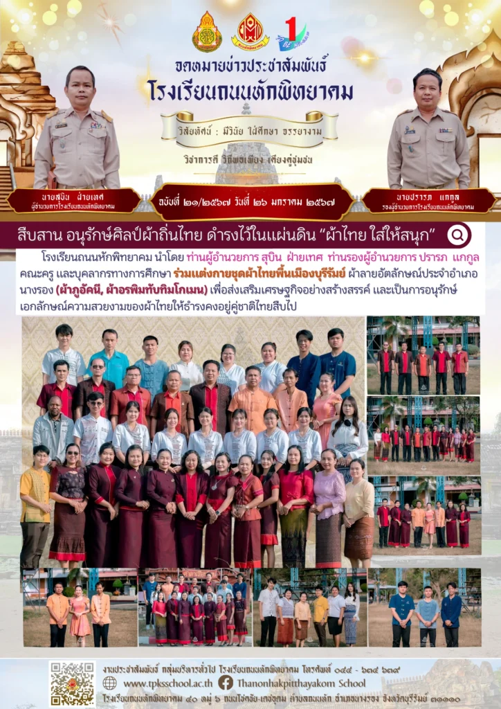 สืบสาน อนุรักษ์ศิลป์ผ้าถิ่นไทย ดำรงไว้ในแผ่นดิน “ผ้าไทย ใส่ให้สนุก”By Sirinun S / January 29, 2024 โรงเรียนถนนหักพิทยาคม นำโดย ท่านผู้อำนวยการ สุบิน ฝ่ายเทศ ท่านรองผู้อำนวยการ ปรารภ แกกูล คณะครู และบุคลากรทางการศึกษา ร่วมแต่งกายชุดผ้าไทยพื้นเมืองบุรีรัมย์ ผ้าลายอัตลักษณ์ประจำอำเภอ นางรอง (ผ้าภูอัคนี, ผ้าอรพิมทับทิมโกเมน) เพื่อส่งเสริมเศรษฐกิจอย่างสร้างสรรค์ และเป็นการอนุรักษ์เอกลักษณ์ความสวยงามของผ้าไทยให้ธำรงคงอยู่คู่ชาติไทยสืบไป📑 ข้อมูลโดย : กลุ่มบริหารงานบุคคล โรงเรียนถนนหักพิทยาคม🎬 ข่าวสารโดย : งานประชาสัมพันธ์ 🖼️ รูปภาพเพิ่มเติม :