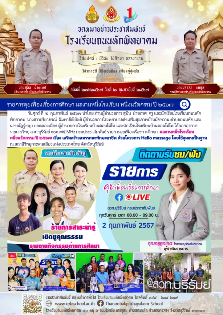 วันศุกร์ ที่ ๒ กุมภาพันธ์ ๒๕๖๗ นำโดย ท่านผู้อำนวยการ สุบิน ฝ่ายเทศ ครู และนักเรียนโรงเรียนถนนหักพิทยาคม นางสาวอริยาภรณ์ ฉิมพาลีชัยโชติ ผู้อำนวยการโรงพยาบาลส่งเสริมสุขภาพบ้านผักหวาน ตำบลถนนหัก และ นางณัฏฐ์ชญา ยอดลองเมือง ผู้อำนวยการโรงเรียนบ้านดอนไม้ไฟ และนักเรียนโรงเรียนบ้านดอนไม้ไฟ ได้ออกอากาศรายการวิทยุ สวท.บุรีรัมย์ ๑๐๑.๗๕ MHz กรมประชาสัมพันธ์ รายการคุยเฟื่องเรื่องการศึกษา ผลงานหนึ่งโรงเรียน หนึ่งนวัตกรรม ปี ๒๕๖๗ เรื่อง เสริมสร้างสมรรถนะทักษะอาชีพ ด้วยโครงการ Hello massage โดยใช้ชุมชนเป็นฐาน ณ สถานีวิทยุกระจายเสียงแห่งประเทศไทย จังหวัดบุรีรัมย์