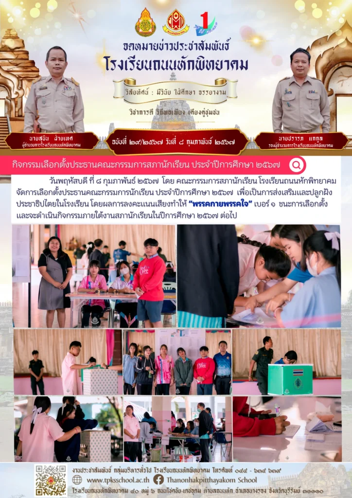 กิจกรรมเลือกตั้งประธานคณะกรรมการสภานักเรียน ประจำปีการศึกษา ๒๕๖๗By Sirinun S / February 13, 2024 วันพฤหัสบดี ที่ ๘ กุมภาพันธ์ ๒๕๖๗ โดย คณะกรรมการสภานักเรียน โรงเรียนถนนหักพิทยาคมจัดการเลือกตั้งประธานคณะกรรมการนักเรียน ประจำปีการศึกษา ๒๕๖๗ เพื่อเป็นการส่งเสริมและปลูกฝังประชาธิปไตยในโรงเรียน โดยผลการลงคะแนนเสียงทำให้ “พรรคกายพรรคใจ” เบอร์ ๑ ชนะการเลือกตั้งและจะดำเนินกิจกรรมภายใต้งานสภานักเรียนในปีการศึกษา ๒๕๖๗ ต่อไป📑 ข้อมูลโดย : งานสภานักเรียน โรงเรียนถนนหักพิทยาคม🎬 ข่าวสารโดย : งานประชาสัมพันธ์ 🖼️ รูปภาพเพิ่มเติม :