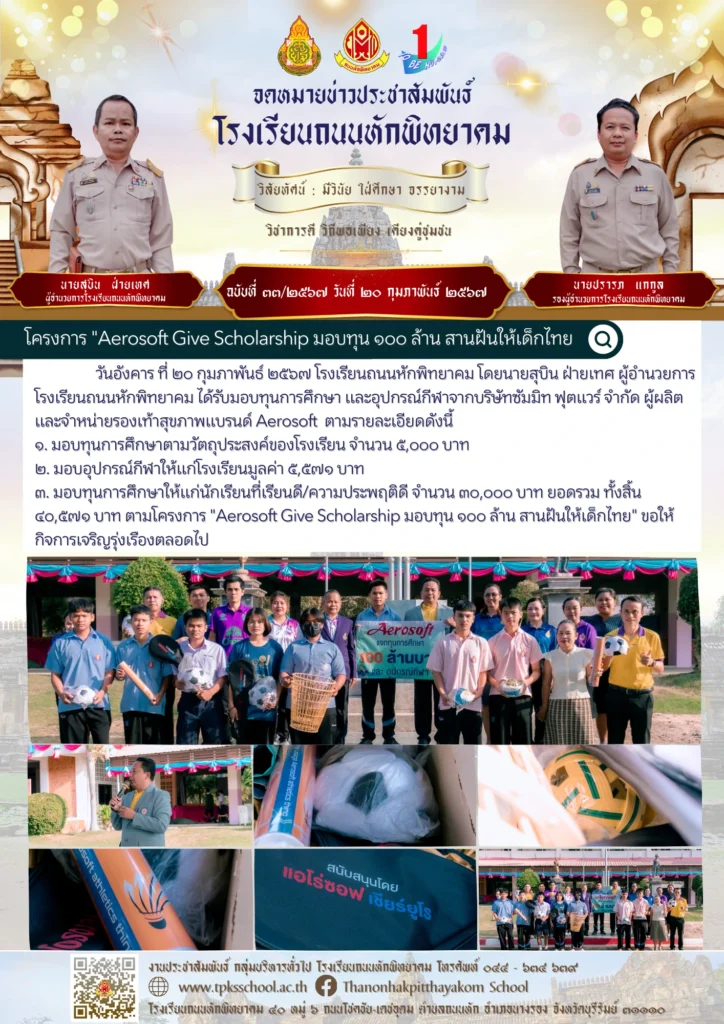 วันอังคาร ที่ ๒๐ กุมภาพันธ์ ๒๕๖๗ โรงเรียนถนนหักพิทยาคม โดยนายสุบิน ฝ่ายเทศ ผู้อำนวยการ โรงเรียนถนนหักพิทยาคม ได้รับมอบทุนการศึกษา และอุปกรณ์กีฬาจากบริษัทซัมมิท ฟุตแวร์ จำกัด ผู้ผลิตและจำหน่ายรองเท้าสุขภาพแบรนด์ Aero soft ตามรายละเอียดดังนี้ ๑. มอบทุนการศึกษาตามวัตถุประสงค์ของโรงเรียน จำนวน ๕,๐๐๐ บาท ๒. มอบอุปกรณ์กีฬาให้แก่โรงเรียนมูลค่า ๕,๕๗๑ บาท ๓. มอบทุนการศึกษาให้แก่นักเรียนที่เรียนดี/ความประพฤติดี จำนวน ๓๐,๐๐๐ บาท ยอดรวม ทั้งสิ้น ๔๐,๕๗๑ บาท ตามโครงการ “Aerosoft Give Scholarship มอบทุน ๑๐๐ ล้าน สานฝันให้เด็กไทย” ขอให้กิจการเจริญรุ่งเรืองตลอดไป