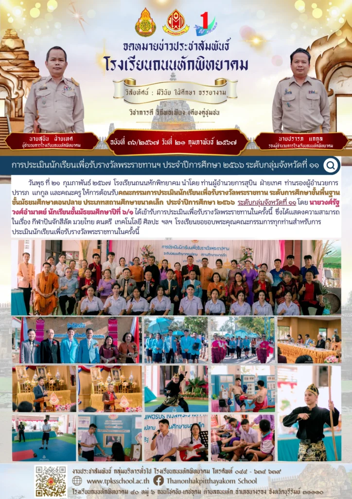 วันพุธ ที่ ๒๑ กุมภาพันธ์ ๒๕๖๗ โรงเรียนถนนหักพิทยาคม นำโดย ท่านผู้อำนวยการสุบิน ฝ่ายเทศ ท่านรองผู้อำนวยการ ปรารภ แกกูล และคณะครู ให้การต้อนรับคณะกรรมการประเมินนักเรียนเพื่อรับรางวัลพระราชทาน ระดับการศึกษาขั้นพื้นฐาน ชั้นมัธยมศึกษาตอนปลาย ประเภทสถานศึกษาขนาดเล็ก ประจำปีการศึกษา ๒๕๖๖ ระดับกลุ่มจังหวัดที่ ๑๑ โดย นายวงศ์รัฐ วงศ์อำมาตย์ นักเรียนชั้นมัธยมศึกษาปีที่ ๖/๑ ได้เข้ารับการประเมินเพื่อรับรางวัลพระราชทานในครั้งนี้ ซึ่งได้แสดงความสามารถ ในเรื่อง กีฬาปันจักสีลัต มวยไทย ดนตรี เทคโนโลยี ศิลปะ ฯลฯ โรงเรียนขอขอบพระคุณคณะกรรมการทุกท่านสำหรับการประเมินนักเรียนเพื่อรับรางวัลพระราชทานในครั้งนี้