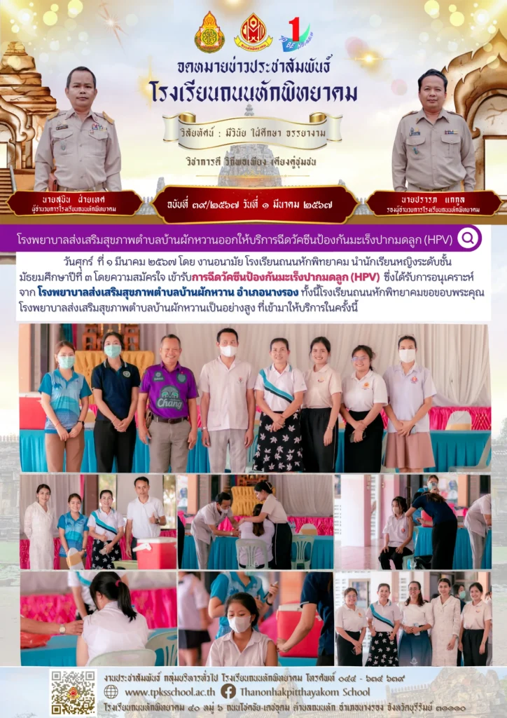 โรงพยาบาลส่งเสริมสุขภาพตำบลบ้านผักหวานออกให้บริการฉีดวัคซีนป้องกันมะเร็งปากมดลูก (HPV)By Sirinun S / March 23, 2024 วันศุกร์ ที่ ๑ มีนาคม ๒๕๖๗ โดย งานอนามัย โรงเรียนถนนหักพิทยาคม นำนักเรียนหญิงระดับชั้นมัธยมศึกษาปีที่ ๓ โดยความสมัครใจ เข้ารับการฉีดวัคซีนป้องกันมะเร็งปากมดลูก (HPV) ซึ่งได้รับการอนุเคราะห์ จาก โรงพยาบาลส่งเสริมสุขภาพตำบลบ้านผักหวาน อำเภอนางรอง ทั้งนี้โรงเรียนถนนหักพิทยาคมขอขอบพระคุณโรงพยาบาลส่งเสริมสุขภาพตำบลบ้านผักหวานเป็นอย่างสูง ที่เข้ามาให้บริการในครั้งนี้📑 ข้อมูลโดย : งานอนามัย โรงเรียนถนนหักพิทยาคม🎬 ข่าวสารโดย : งานประชาสัมพันธ์ 🖼️ รูปภาพเพิ่มเติม :