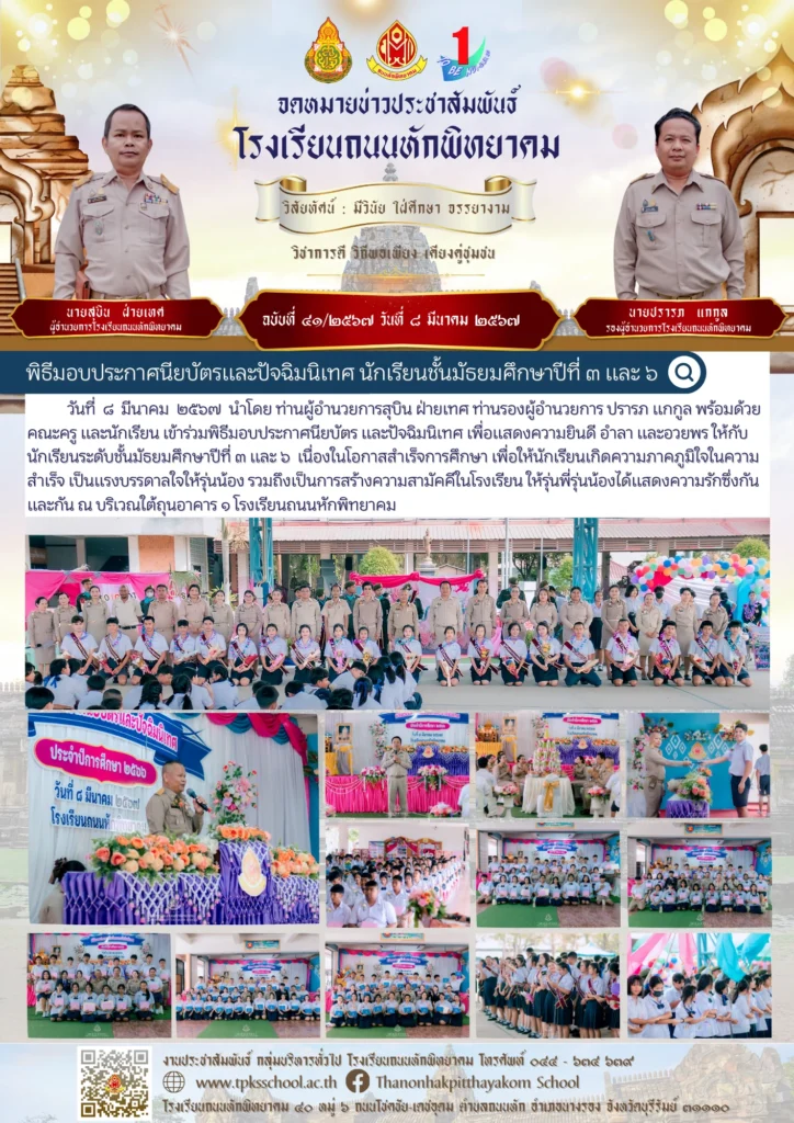 วันที่ ๘ มีนาคม ๒๕๖๗ นำโดย ท่านผู้อำนวยการสุบิน ฝ่ายเทศ ท่านรองผู้อำนวยการ ปรารภ แกกูล พร้อมด้วยคณะครู และนักเรียน เข้าร่วมพิธีมอบประกาศนียบัตร และปัจฉิมนิเทศ เพื่อแสดงความยินดี อำลา และอวยพร ให้กับนักเรียนระดับชั้นมัธยมศึกษาปีที่ ๓ และ ๖ เนื่องในโอกาสสำเร็จการศึกษา เพื่อให้นักเรียนเกิดความภาคภูมิใจในความสำเร็จ เป็นแรงบรรดาลใจให้รุ่นน้อง รวมถึงเป็นการสร้างความสามัคคีในโรงเรียน ให้รุ่นพี่รุ่นน้องได้แสดงความรักซึ่งกันและกัน ณ บริเวณใต้ถุนอาคาร ๑ โรงเรียนถนนหักพิทยาคม