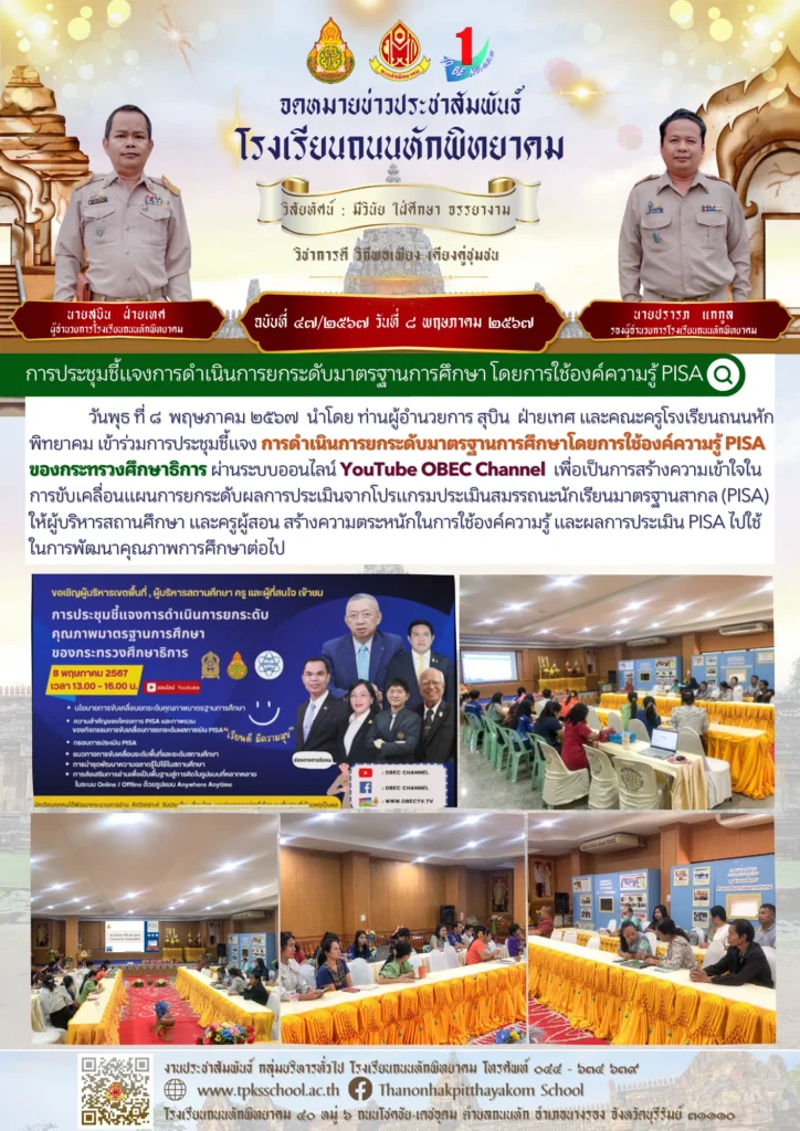 วันพุธ ที่ ๘ พฤษภาคม ๒๕๖๗ นำโดย ท่านผู้อำนวยการ สุบิน ฝ่ายเทศ และคณะครูโรงเรียนถนนหักพิทยาคม เข้าร่วมการประชุมชี้แจง การดำเนินการยกระดับมาตรฐานการศึกษาโดยการใช้องค์ความรู้ PISA ของกระทรวงศึกษาธิการ ผ่านระบบออนไลน์ YouTube OBEC Channel เพื่อเป็นการสร้างความเข้าใจในการขับเคลื่อนแผนการยกระดับผลการประเมินจากโปรแกรมประเมินสมรรถนะนักเรียนมาตรฐานสากล (PISA) ให้ผู้บริหารสถานศึกษา และครูผู้สอน สร้างความตระหนักในการใช้องค์ความรู้ และผลการประเมิน PISA ไปใช้ในการพัฒนาคุณภาพการศึกษาต่อไป