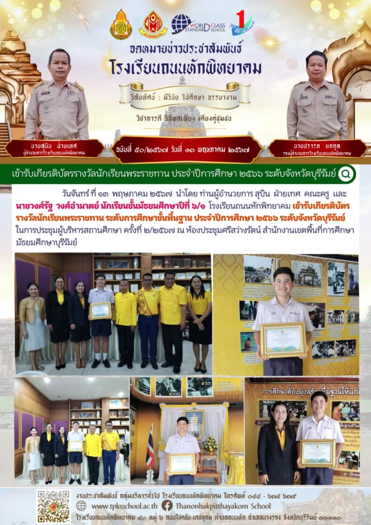 เข้ารับเกียรติบัตรรางวัลนักเรียนพระราชทาน ประจำปีการศึกษา ๒๕๖๖ ระดับจังหวัดบุรีรัมย์By Sirinun S / May 15, 2024 วันจันทร์ ที่ ๑๓ พฤษภาคม ๒๕๖๗ นำโดย ท่านผู้อำนวยการ สุบิน ฝ่ายเทศ คณะครู และ นายวงศ์รัฐ วงศ์อำมาตย์ นักเรียนชั้นมัธยมศึกษาปีที่ ๖/๑ โรงเรียนถนนหักพิทยาคม เข้ารับเกียรติบัตรรางวัลนักเรียนพระราชทาน ระดับการศึกษาขั้นพื้นฐาน ประจำปีการศึกษา ๒๕๖๖ ระดับจังหวัดบุรีรัมย์ ในการประชุมผู้บริหารสถานศึกษา ครั้งที่ ๒/๒๕๖๗ ณ ห้องประชุมศรีสว่างรัตน์ สำนักงานเขตพื้นที่การศึกษามัธยมศึกษาบุรีรัมย์📑 ข้อมูลโดย : กลุ่มบริหารวิชาการ โรงเรียนถนนหักพิทยาคม🎬 ข่าวสารโดย : งานประชาสัมพันธ์ 🖼️ รูปภาพเพิ่มเติม :