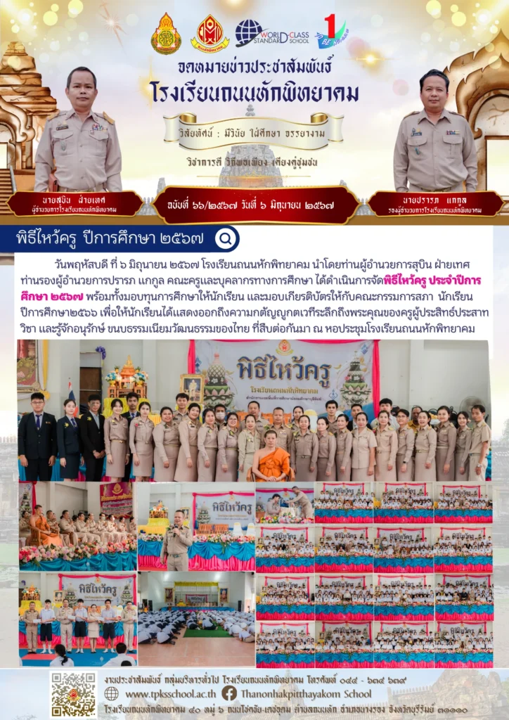 วันพฤหัสบดี ที่ ๖ มิถุนายน ๒๕๖๗ โรงเรียนถนนหักพิทยาคม นำโดยท่านผู้อำนวยการสุบิน ฝ่ายเทศ ท่านรองผู้อำนวยการปรารภ แกกูล คณะครูและบุคลากรทางการศึกษา ได้ดำเนินการจัดพิธีไหว้ครู ประจำปีการศึกษา ๒๕๖๗ พร้อมทั้งมอบทุนการศึกษาให้นักเรียน และมอบเกียรติบัตรให้กับคณะกรรมการสภา นักเรียน ปีการศึกษา๒๕๖๖ เพื่อให้นักเรียนได้แสดงออกถึงความกตัญญูกตเวทีระลึกถึงพระคุณของครูผู้ประสิทธ์ประสาท วิซา และรู้จักอนุรักษ์ ขนบธรรมเนียมวัฒนธรรมของไทย ที่สืบต่อกันมา ณ หอประชุมโรงเรียนถนนหักพิทยาคม