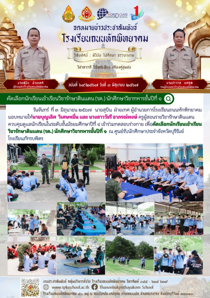 คัดเลือกนักเรียนเข้าเรียนวิชารักษาดินแดน (รด.) นักศึกษาวิชาทหารชั้นปีที่ ๑By Sirinun S / June 20, 2024 วันจันทร์ ที่ ๓ มิถุนายน ๒๕๖๗ นายสุบิน ฝ่ายเทศ ผู้อำนวยการโรงเรียนถนนหักพิทยาคม มอบหมายให้นายบุญเลิศ วิเศษหมื่น และ นางสาววัชรี อาภรณ์พงษ์ ครูผู้สอนรายวิชารักษาดินแดน ควบคุมดูแลนักเรียนในระดับชั้นมัธยมศึกษาปีที่ ๔ เข้าร่วมทดสอบร่างกาย เพื่อคัดเลือกนักเรียนเข้าเรียนวิชารักษาดินแดน (รด.) นักศึกษาวิชาทหารชั้นปีที่ ๑ ณ ศูนย์รับนักศึกษาประจำจังหวัดบุรีรัมย์ โรงเรียนภัทรบพิตร 📑 ข้อมูลโดย : กิจกรรมพัฒนาผู้เรียน โรงเรียนถนนหักพิทยาคม🎬 ข่าวสารโดย : งานประชาสัมพันธ์ 🖼️ รูปภาพเพิ่มเติม :