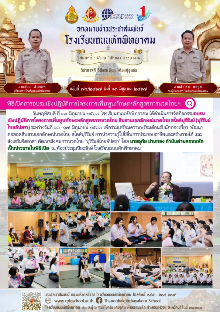 วันพฤหัสบดี ที่ ๑๓ มิถุนายน ๒๕๖๗ โรงเรียนถนนหักพิทยาคม ได้ดำเนินการจัดกิจกรรมอบรมเชิงปฏิบัติการโครงการเพิ่มพูนทักษะหลักสูตรการนวดไทย สืบสานเอกลักษณ์นวดไทย สไตล์บุรีรัมย์ (บุรีรัมย์ไทยอัปสรา) ระหว่างวันที่ ๑๓ – ๑๗ มิถุนายน ๒๕๖๗ เพื่อร่วมเตรียมความพร้อมต้อนรับนักท่องเที่ยว พัฒนาต่อยอดสืบสานเอกลักษณ์นวดไทย สไตล์บุรีรัมย์ การนำความรู้ไปใช้ในการประกอบอาชีพและสร้างรายได้ และ ส่งเสริมจิตอาสา พัฒนาสังคมการนวดไทย “บุรีรัมย์ไทยอัปสรา” โดย นายอุทัย ม่านทอง กำนันตำบลถนนหัก เป็นประธานในพิธีเปิด ณ ห้องประชุมปิยะรักษ์ โรงเรียนถนนหักพิทยาคม