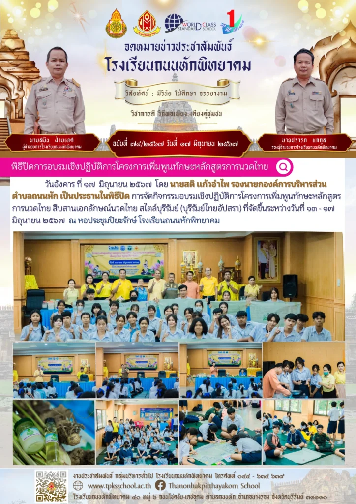 พิธีปิดการอบรมเชิงปฏิบัติการโครงการเพิ่มพูนทักษะหลักสูตรการนวดไทยBy Sirinun S / June 20, 2024 วันอังคาร ที่ ๑๗ มิถุนายน ๒๕๖๗ โดย นายสติ แก้วอำไพ รองนายกองค์การบริหารส่วนตำบลถนนหัก เป็นประธานในพิธีปิด การจัดกิจกรรมอบรมเชิงปฏิบัติการโครงการเพิ่มพูนทักษะหลักสูตรการนวดไทย สืบสานเอกลักษณ์นวดไทย สไตล์บุรีรัมย์ (บุรีรัมย์ไทยอัปสรา) ที่จัดขึ้นระหว่างวันที่ ๑๓ – ๑๗ มิถุนายน ๒๕๖๗ ณ หอประชุมปิยะรักษ์ โรงเรียนถนนหักพิทยาคม 📑 ข้อมูลโดย : หลักสูตรสืบสานนวดไทย โรงเรียนถนนหักพิทยาคม🎬 ข่าวสารโดย : งานประชาสัมพันธ์ 🖼️ รูปภาพเพิ่มเติม :