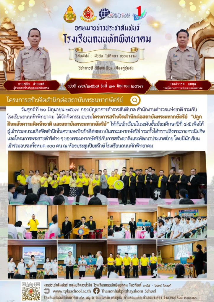 วันศุกร์ ที่ ๒๑ มิถุนายน ๒๕๖๗ กองบัญชาการตำรวจสันติบาล สำนักงานตำรวจแห่งชาติ ร่วมกับ โรงเรียนถนนหักพิทยาคม ได้จัดกิจกรรมอบรมโครงการสร้างจิตสำนึกต่อสถาบันพระมหากษัตริย์ “ปลูกฝังพลังความคิดรักชาติ และสถาบันพระมหากษัตริย์“ ให้กับนักเรียนในระดับชั้นมัยมศึกษาปีที่ ๔-๕ เพื่อให้ผู้เข้าร่วมอบรมเกิดจิตสำนึกในความจงรักภักดีต่อสถาบันพระมหากษัตริย์ รวมทั้งได้ทราบถึงพระราชกรณียกิจ และโครงการพระราชดำริต่าง ๆ ของพระมหากษัตริย์กับการสร้างชาติและพัฒนาประเทศไทย โดยมีนักเรียนเข้าร่วมอบรมทั้งหมด ๑๐๐ คน ณ ห้องประชุมปิยะรักษ์ โรงเรียนถนนหักพิทยาคม