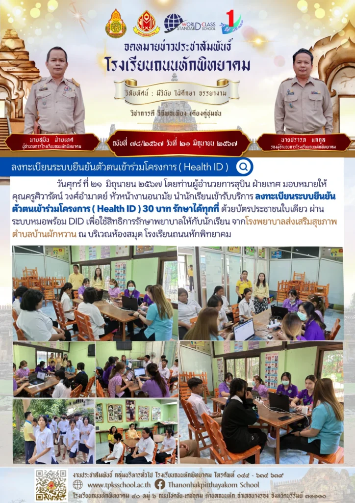 ลงทะเบียนระบบยืนยันตัวตนเข้าร่วมโครงการ ( Health ID )By Sirinun S / June 27, 2024 วันศุกร์ ที่ ๒๑ มิถุนายน ๒๕๖๗ โดยท่านผู้อำนวยการสุบิน ฝ่ายเทศ มอบหมายให้ คุณครูศิวารัตน์ วงศ์อำมาตย์ หัวหน้างานอนามัย นำนักเรียนเข้ารับบริการ ลงทะเบียนระบบยืนยัน ตัวตนเข้าร่วมโครงการ ( Health ID ) 30 บาท รักษาได้ทุกที่ ด้วยบัตรประชาชนใบเดียว ผ่านระบบหมอพร้อม DID เพื่อใช้สิทธิการรักษาพยาบาลให้กับนักเรียน จากโรงพยาบาลส่งเสริมสุขภาพตำบลบ้านผักหวาน ณ บริเวณห้องสมุด โรงเรียนถนนหักพิทยาคม📑 ข้อมูลโดย : งานอนามัย โรงเรียนถนนหักพิทยาคม🎬 ข่าวสารโดย : งานประชาสัมพันธ์ 🖼️ รูปภาพเพิ่มเติม :