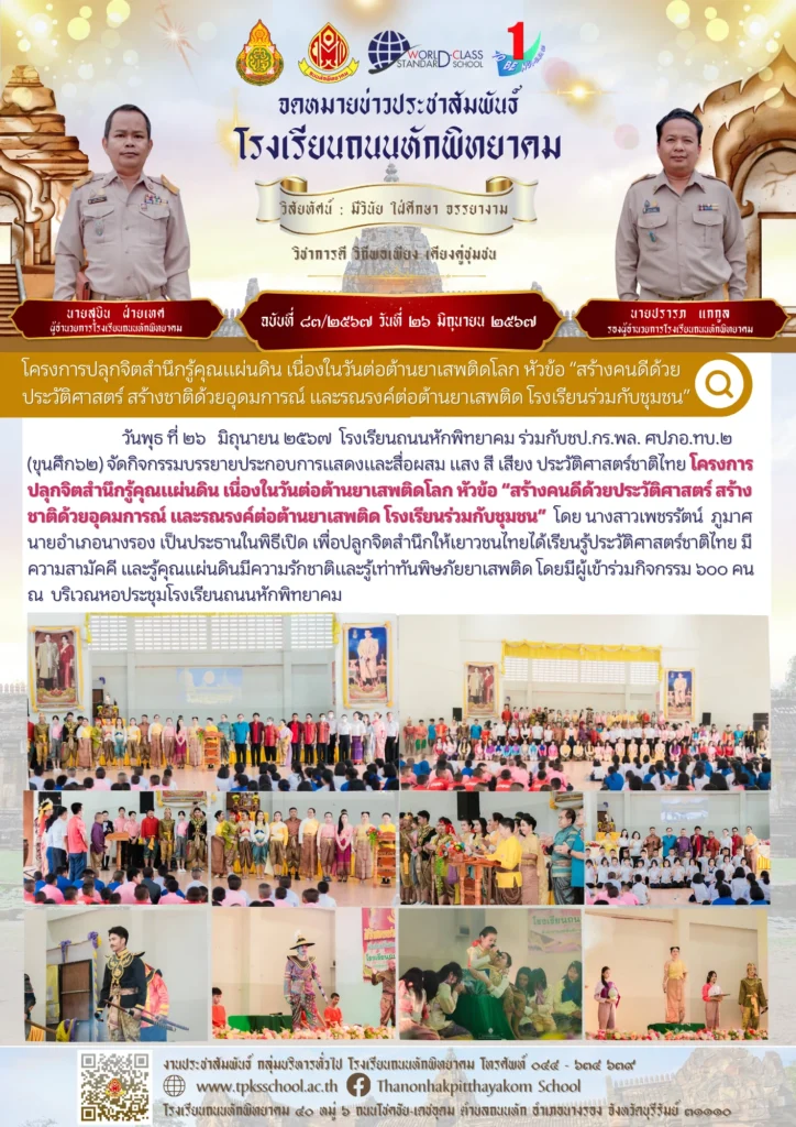 วันอังคาร ที่ ๒๕ มิถุนายน ๒๕๖๗ โรงเรียนถนนหักพิทยาคม โดย นางชนกานต์ เหลาแตว นางสาวรัตนาภรณ์ ศิริพงษ์ และนักเรียนแกนนำชมรม TO BE NUMBER ONE โรงเรียนถนนหักพิทยาคมได้รับเชิญเป็นวิทยากร กิจกรรมอบรมเชิงปฏิบัติการพัฒนาอำเภอและแกนนำ TO BE NUMBER ONE ต้นแบบ โครงการพัฒนาเมืองบุรีรัมย์ให้เป็นเมืองแห่งความสงบสุข กิจกรรมหลัก การรณรงค์ป้องกันและแก้ไขปัญหา ยาเสพติด TO BE NUMBER ONE จังหวัดบุรีรัมย์ ประจำปี ๒๕๖๗ ของ สำนักงานสาธารณสุขจังหวัดบุรีรัมย์ ณ ห้องประชุมโรงเรียนราชประชานุเคราะห์ ๕๑ ตำบลนางรอง อำเภอนางรอง จังหวัดบุรีรัมย์