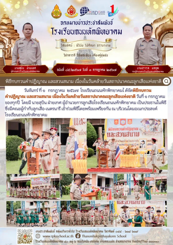 พิธีทบทวนคำปฏิญาณ และสวนสนาม เนื่องในวันคล้ายวันสถาปนาคณะลูกเสือแห่งชาติBy Sirinun S / July 2, 2024 วันจันทร์ ที่ ๑ กรกฎาคม ๒๕๖๗ โรงเรียนถนนหักพิทยาคมไ ด้จัดพิธีทบทวน คำปฏิญาณ และสวนสนาม เนื่องในวันคล้ายวันสถาปนาคณะลูกเสือแห่งชาติ วันที่ ๑ กรกฎาคม ของทุกปี โดยมี นายสุบิน ฝ่ายเทศ ผู้อำนวยการลูกเสือโรงเรียนถนนหักพิทยาคม เป็นประธานในพิธี ซึ่งมีคณะผู้กำกับลูกเสือ-เนตรนารี เข้าร่วมพิธีโดยพร้อมเพรียงกัน ณ บริเวณโดมอเนกประสงค์ โรงเรียนถนนหักพิทยาคม📑 ข้อมูลโดย : กิจกรรมพัฒนาผู้เรียน โรงเรียนถนนหักพิทยาคม🎬 ข่าวสารโดย : งานประชาสัมพันธ์ 🖼️ รูปภาพเพิ่มเติม :