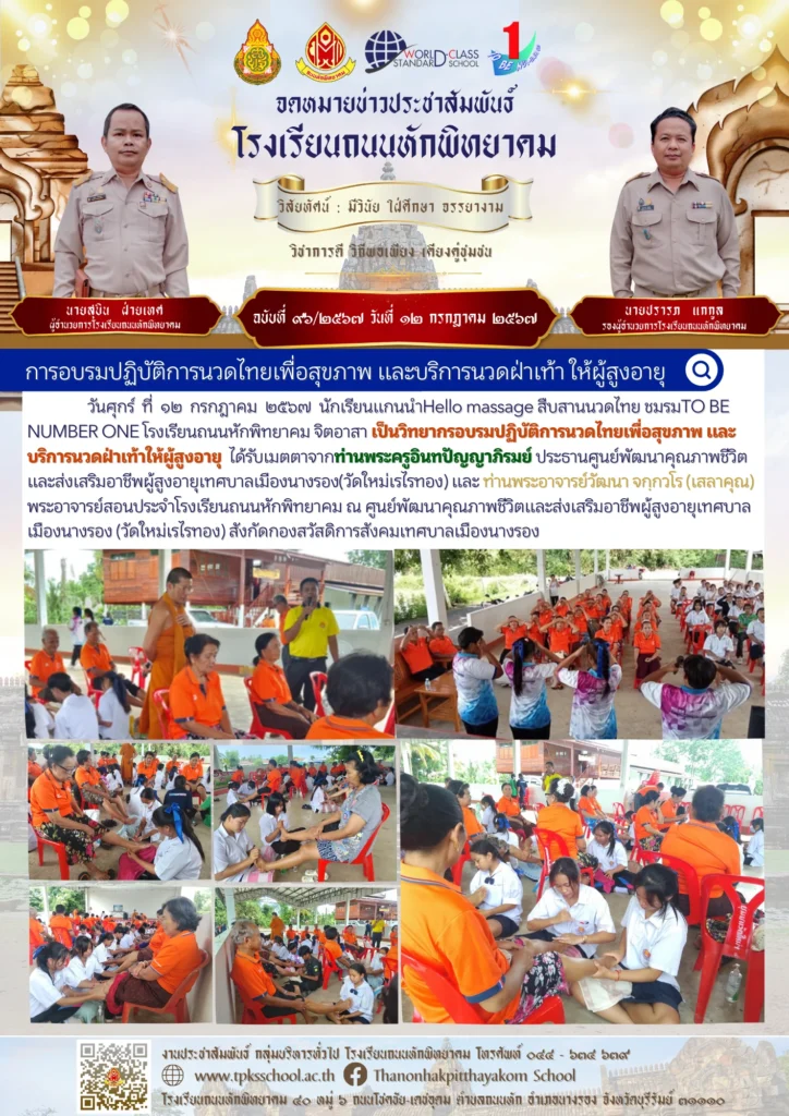วันศุกร์ ที่ ๑๒ กรกฎาคม ๒๕๖๗ นักเรียนแกนนำ Hello massage สืบสานนวดไทย ชมรม TO BE NUMBER ONE โรงเรียนถนนหักพิทยาคม จิตอาสา เป็นวิทยากรอบรมปฏิบัติการนวดไทยเพื่อสุขภาพ และบริการนวดฝ่าเท้าให้ผู้สูงอายุ ได้รับเมตตาจากท่านพระครูอินทปัญญาภิรมย์ ประธานศูนย์พัฒนาคุณภาพชีวิตและส่งเสริมอาชีพผู้สูงอายุเทศบาลเมืองนางรอง(วัดใหม่เรไรทอง) และ ท่านพระอาจารย์วัฒนา จกฺกวโร (เสลาคุณ) พระอาจารย์สอนประจำโรงเรียนถนนหักพิทยาคม ณ ศูนย์พัฒนาคุณภาพชีวิตและส่งเสริมอาชีพผู้สูงอายุเทศบาลเมืองนางรอง (วัดใหม่เรไรทอง) สังกัดกองสวัสดิการสังคมเทศบาลเมืองนางรอง