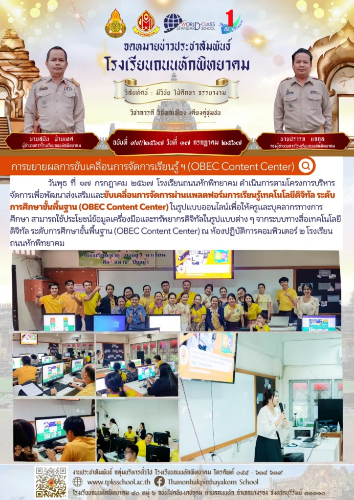 วันพุธ ที่ ๑๗ กรกฎาคม ๒๕๖๗ โรงเรียนถนนหักพิทยาคม ดำเนินการตามโครงการบริหารจัดการเพื่อพัฒนาส่งเสริมและขับเคลื่อนการจัดการผ่านแพลตฟอร์มการเรียนรู้เทคโนโลยีดิจิทัล ระดับ การศึกษาขั้นพื้นฐาน (OBEC Content Center) ในรูปแบบออนไลน์เพื่อให้ครูและบุคลากรทางการศึกษา สามารถใช้ประโยชน์ข้อมูลเครื่องมือและทรัพยากรดิจิทัลในรูปแบบต่าง ๆ จากระบบทางสื่อเทคโนโลยีดิจิทัล ระดับการศึกษาขั้นพื้นฐาน (OBEC Content Center) ณ ห้องปฏิบัติการคอมพิวเตอร์ ๒ โรงเรียนถนนหักพิทยาคม