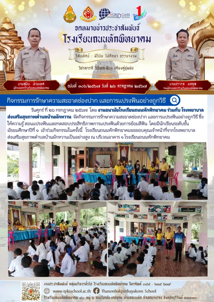 วันศุกร์ ที่ ๒๖ กรกฎาคม ๒๕๖๗ โดย งานอนามัยโรงเรียนถนนหักพิทยาคม ร่วมกับ โรงพยาบาล ส่งเสริมสุขภาพตำบลบ้านผักหวาน จัดกิจกรรมการรักษาความสะอาดช่องปาก และการแปรงฟันอย่างถูกวิธี ซึ่งให้ความรู้ สอนแปรงฟันและทดสอบประสิทธิภาพการแปรงฟันด้วยการย้อมสีฟัน โดยมีนักเรียนระดับชั้นมัธยมศึกษาปีที่ ๑ เข้าร่วมกิจกรรมในครั้งนี้ โรงเรียนถนนหักพิทยาคมขอขอบคุณเจ้าหน้าที่จากโรงพยาบาล ส่งเสริมสุขภาพตำบลบ้านผักหวานเป็นอย่างสูง ณ บริเวณอาคาร ๑ โรงเรียนถนนหักพิทยาคม