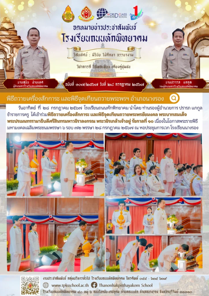 พิธีถวายเครื่องสักการะ และพิธีจุดเทียนถวายพระพรฯ อำเภอนางรองBy Sirinun S / August 1, 2024 วันอาทิตย์ ที่ ๒๘ กรกฎาคม ๒๕๖๗ โรงเรียนถนนหักพิทยาคม นำโดย ท่านรองผู้อำนวยการ ปรารภ แกกูล ข้าราชการครู ได้เข้าร่วมพิธีถวายเครื่องสักการะ และพิธีจุดเทียนถวายพระพรชัยมงคล พระบาทสมเด็จ พระปรเมนทรรามาธิบดีศรีสินทรมหาวชิราลงกรณ พระวชิรเกล้าเจ้าอยู่ รัชกาลที่ ๑๐ เนื่องในโอกาสพระราชพิธีมหามงคลเฉลิมพระชนมพรรษา ๖ รอบ ๗๒ พรรษา ๒๘ กรกฎาคม ๒๕๖๗ ณ หอประชุมการเวก โรงเรียนนางรอง📑 ข้อมูลโดย : กลุ่มบริหารงานทั่วไป โรงเรียนถนนหักพิทยาคม🎬 ข่าวสารโดย : งานประชาสัมพันธ์ 🖼️ รูปภาพเพิ่มเติม :