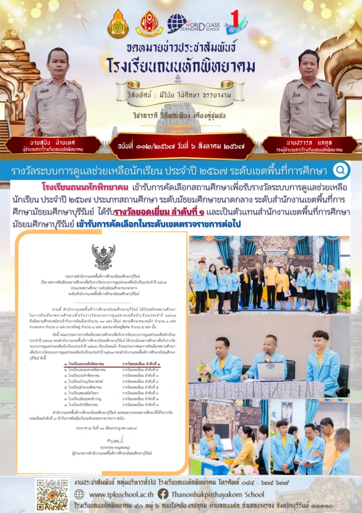 รางวัลระบบการดูแลช่วยเหลือนักเรียน ประจำปี ๒๕๖๗ ระดับเขตพื้นที่การศึกษาBy Sirinun S / August 8, 2024 โรงเรียนถนนหักพิทยาคม เข้ารับการคัดเลือกสถานศึกษาเพื่อรับรางวัลระบบการดูแลช่วยเหลือนักเรียน ประจำปี ๒๕๖๗ ประเภทสถานศึกษา ระดับมัธยมศึกษาขนาดกลาง ระดับสำนักงานเขตพื้นที่การศึกษามัธยมศึกษาบุรีรัมย์ ได้รับรางวัลยอดเยี่ยม ลำดับที่ ๑ และเป็นตัวแทนสำนักงานเขตพื้นที่การศึกษามัธยมศึกษาบุรีรัมย์ เข้ารับการคัดเลือกในระดับเขตตรวจราชการต่อไป📑 ข้อมูลโดย : งานระบบดูแลช่วยเหลือนักเรียน โรงเรียนถนนหักพิทยาคม🎬 ข่าวสารโดย : งานประชาสัมพันธ์ 🖼️ รูปภาพเพิ่มเติม :