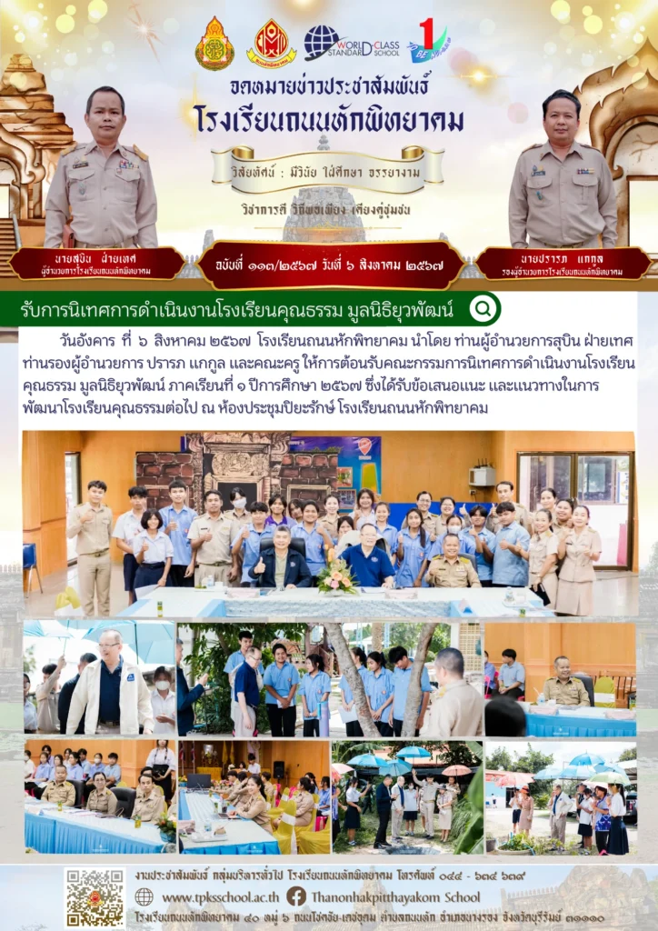 รับการนิเทศการดำเนินงานโรงเรียนคุณธรรม มูลนิธิยุวพัฒน์By Sirinun S / August 8, 2024 วันอังคาร ที่ ๖ สิงหาคม ๒๕๖๗ โรงเรียนถนนหักพิทยาคม นำโดย ท่านผู้อำนวยการสุบิน ฝ่ายเทศ ท่านรองผู้อำนวยการ ปรารภ แกกูล และคณะครู ให้การต้อนรับคณะกรรมการนิเทศการดำเนินงานโรงเรียนคุณธรรม มูลนิธิยุวพัฒน์ ภาคเรียนที่ ๑ ปีการศึกษา ๒๕๖๗ ซึ่งได้รับข้อเสนอแนะ และแนวทางในการพัฒนาโรงเรียนคุณธรรมต่อไป ณ ห้องประชุมปิยะรักษ์ โรงเรียนถนนหักพิทยาคม📑 ข้อมูลโดย : กลุ่มสาระการเรียนรู้สังคมศึกษา ศาสนา และวัฒนธรรม โรงเรียนถนนหักพิทยาคม🎬 ข่าวสารโดย : งานประชาสัมพันธ์ 🖼️ รูปภาพเพิ่มเติม :