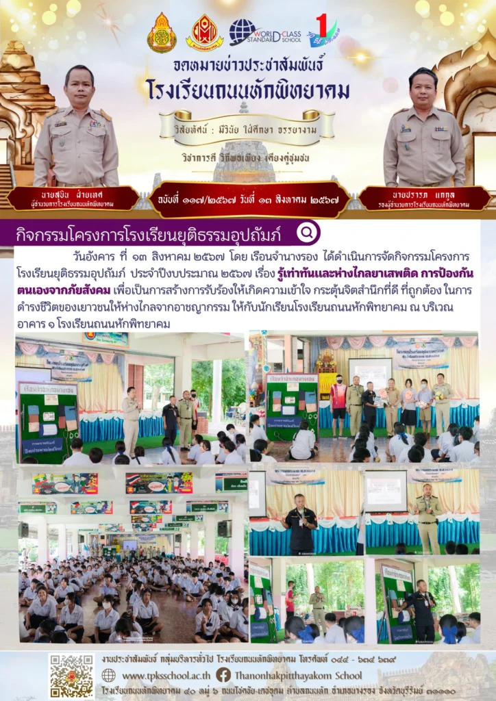 กิจกรรมโครงการโรงเรียนยุติธรรมอุปถัมภ์By Sirinun S / August 23, 2024 วันอังคาร ที่ ๑๓ สิงหาคม ๒๕๖๗ โดย เรือนจำนางรอง ได้ดำเนินการจัดกิจกรรมโครงการโรงเรียนยุติธรรมอุปถัมภ์ ประจำปีงบประมาณ ๒๕๖๗ เรื่อง รู้เท่าทันและห่างไกลยาเสพติด การป้องกันตนเองจากภัยสังคม เพื่อเป็นการสร้างการรับร้องให้เกิดความเข้าใจ กระตุ้นจิตสำนึกที่ดี ที่ถูกต้อง ในการดำรงชีวิตของเยาวชนให้ห่างไกลจากอาชญากรรม ให้กับนักเรียนโรงเรียนถนนหักพิทยาคม ณ บริเวณอาคาร ๑ โรงเรียนถนนหักพิทยาคม📑 ข้อมูลโดย : กลุ่มงานบริหารทั่วไป โรงเรียนถนนหักพิทยาคม🎬 ข่าวสารโดย : งานประชาสัมพันธ์ 🖼️ รูปภาพเพิ่มเติม :