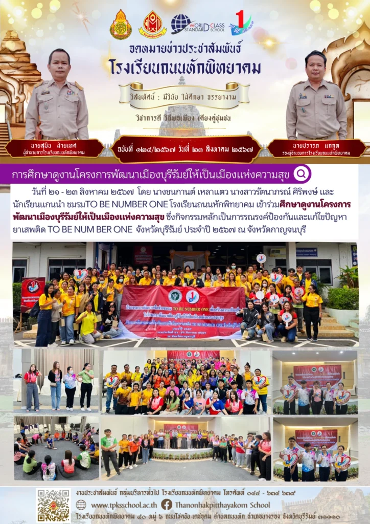 วันที่ ๒๑ – ๒๓ สิงหาคม ๒๕๖๗โดย นางชนกานต์ เหลาแตว นางสาวรัตนาภรณ์ ศิริพงษ์ และนักเรียนแกนนำ ชมรมTO BE NUMBER ONE โรงเรียนถนนหักพิทยาคม เข้าร่วมศึกษาดูงานโครงการพัฒนาเมืองบุรีรัมย์ให้เป็นเมืองแห่งความสุข ซึ่งกิจกรรมหลักเป็นการรณรงค์ป้องกันและแก้ไขปัญหายาเสพติด TO BE NUM BER ONEจังหวัดบุรีรัมย์ ประจำปี ๒๕๖๗ ณ จังหวัดกาญจนบุรี