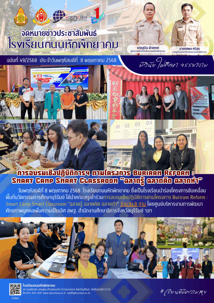 การอบรมเชิงปฏิบัติการฯ ตามโครงการ Buriram Reform : Smart Camp Smart Classroom “ฉลาดรู้ ฉลาดคิด ฉลาดทำ”By Sirinun S / May 27, 2025 วันพฤหัสบดีที่ 8 พฤษภาคม 2568 โรงเรียนถนนหักพิทยาคม ซึ่งเป็นโรงเรียนนำร่องโครงการขับเคลื่อนพื้นที่นวัตกรรมการศึกษาบุรีรัมย์ ได้นำคณะครูเข้าร่วมการอบรมเชิงปฏิบัติการตามโครงการ Buriram Reform : Smart Camp Smart Classroom “ฉลาดรู้ ฉลาดคิด ฉลาดทำ” จำนวน 8 ฐาน โดยศูนย์บริหารงานการพัฒนาศักยภาพบุคคลเพื่อความเป็นเลิศ สพฐ. สำนักงานศึกษาธิการจังหวัดบุรีรัมย์ ฯลฯ 📑 ข้อมูลโดย : กลุ่มบริหารวิชาการ โรงเรียนถนนหักพิทยาคม ข่าวสารโดย : งานประชาสัมพันธ์ 🖼️ รูปภาพเพิ่มเติม :