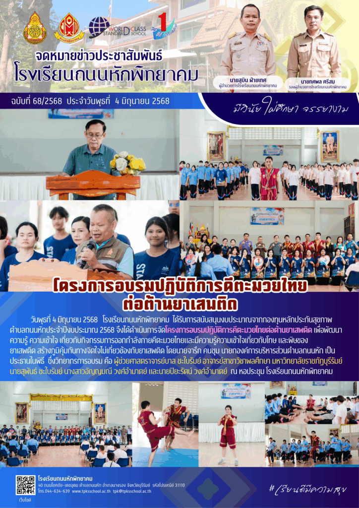วันพุธที่ 4 มิถุนายน 2568 โรงเรียนถนนหักพิทยาคม ได้รับการสนับสนุนงบประมาณจากกองทุนหลักประกันสุขภาพ ตำบลถนนหักประจำปีงบประมาณ 2568 จึงได้ดำเนินการจัดโครงการอบรมปฏิบัติการคีตะมวยไทยต่อต้านยาเสพติด เพื่อพัฒนาความรู้ ความเข้าใจ เกี่ยวกับกิจกรรมการออกกำลังกายคีตะมวยไทยและมีความรู้ความเข้าใจเกี่ยวกับโทษ และพิษของยาเสพติด สร้างภูมิคุ้มกันทางจิตใจไม่เกี่ยวข้องกับยาเสพติด โดยนายจารึก คนชุม นายกองค์การบริหารส่วนตำบลถนนหัก เป็น ประธานในพิธี ซึ่งวิทยากรการอบรม คือ ผู้ช่วยศาสตราจารย์บาล ชะใบรัมย์ อาจารย์สาขาวิชาพลศึกษา มหาวิทยาลัยราชภัฏบุรีรัมย์ นายสุพันธ์ ชะใบรัมย์ นางสาวอัญญมณี วงศ์อำมาตย์ และนายปิยะรัตน์ วงศ์อำมาตย์ ณ หอประชุม โรงเรียนถนนหักพิทยาคม