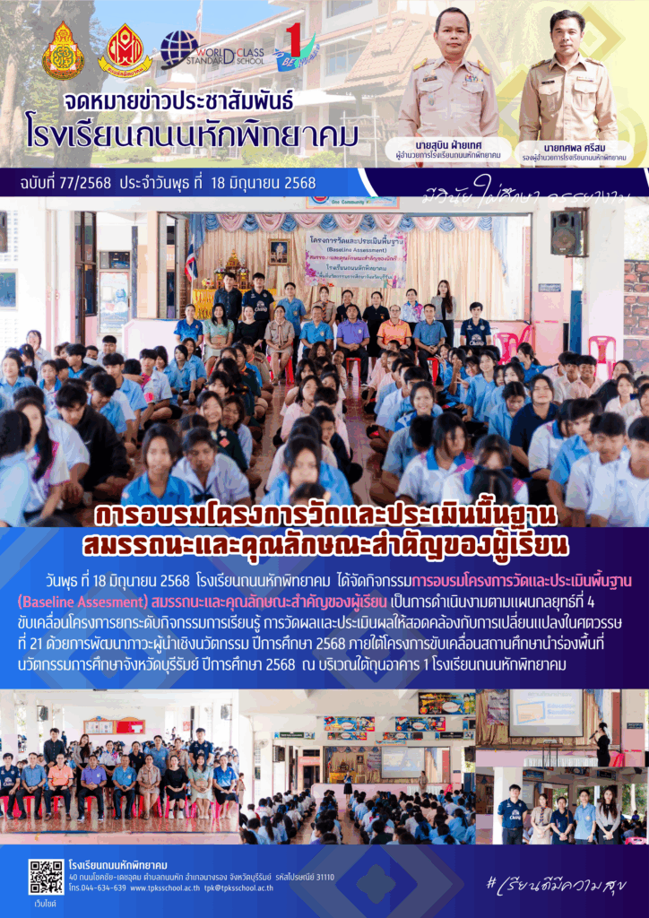 วันพุธ ที่ 18 มิถุนายน 2568 โรงเรียนถนนหักพิทยาคม ได้จัดกิจกรรมการอบรมโครงการวัดและประเมินพื้นฐาน (Baseline Assesment) สมรรถนะและคุณลักษณะสำคัญของผู้เรียน เป็นการดำเนินงามตามแผนกลยุทธ์ที่ 4 ขับเคลื่อนโครงการยกระดับกิจกรรมการเรียนรู้ การวัดผลและประเมินผลให้สอดคล้องกับการเปลี่ยนแปลงในศตวรรษ ที่ 21 ด้วยการพัฒนาภาวะผู้นำเชิงนวัตกรรม ปีการศึกษา 2568 ภายใต้โครงการขับเคลื่อนสถานศึกษานำร่องพื้นที่นวัตกรรมการศึกษาจังหวัดบุรีรัมย์ ปีการศึกษา 2568 ณ บริเวณใต้ถุนอาคาร 1 โรงเรียนถนนหักพิทยาคม