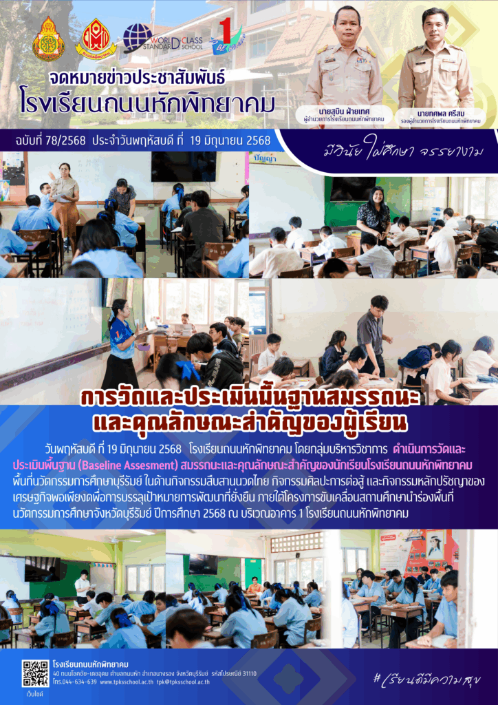 วันพฤหัสบดี ที่ 19 มิถุนายน 2568 โรงเรียนถนนหักพิทยาคม โดยกลุ่มบริหารวิชาการ ดำเนินการวัดและประเมินพื้นฐาน (Baseline Assesment) สมรรถนะและคุณลักษณะสำคัญของนักเรียนโรงเรียนถนนหักพิทยาคม พื้นที่นวัตกรรมการศึกษาบุรีรัมย์ ในด้านกิจกรรมสืบสานนวดไทย กิจกรรมศิลปะการต่อสู้ และกิจกรรมหลักปรัชญาของเศรษฐกิจพอเพียงดพื่อการบรรลุเป้าหมายการพัฒนาที่ยั่งยืน ภายใต้โครงการขับเคลื่อนสถานศึกษานำร่องพื้นที่นวัตกรรมการศึกษาจังหวัดบุรีรัมย์ ปีการศึกษา 2568 ณ บริเวณอาคาร 1 โรงเรียนถนนหักพิทยาคม