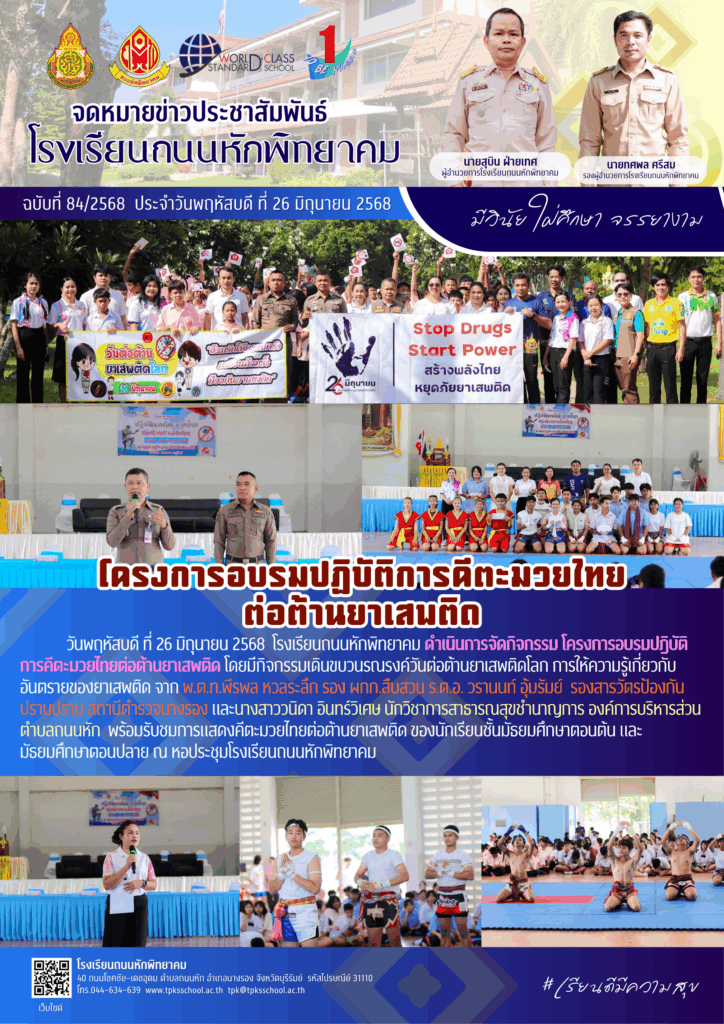 วันพฤหัสบดี ที่ 26 มิถุนายน 2568 โรงเรียนถนนหักพิทยาคม ดำเนินการจัดกิจกรรม โครงการอบรมปฏิบัติการคีตะมวยไทยต่อต้านยาเสพติด โดยมีกิจกรรมเดินขบวนรณรงค์วันต่อต้านยาเสพติดโลก การให้ความรู้เกี่ยวกับอันตรายของยาเสพติด จาก พ.ต.ท.พีรพล หวลระลึก รอง ผกก.สืบสวน ร.ต.อ. วรานนท์ อุ้มรัมย์ รองสารวัตรป้องกันปราบปราม สถานีตำรวจนางรอง และนางสาววนิดา อินทร์วิเศษ นักวิชาการสาธารณสุขชำนาญการ องค์การบริหารส่วนตำบลถนนหัก พร้อมรับชมการแสดงคีตะมวยไทยต่อต้านยาเสพติด ของนักเรียนชั้นมัธยมศึกษาตอนต้น และมัธยมศึกษาตอนปลาย ณ หอประชุมโรงเรียนถนนหักพิทยาคม