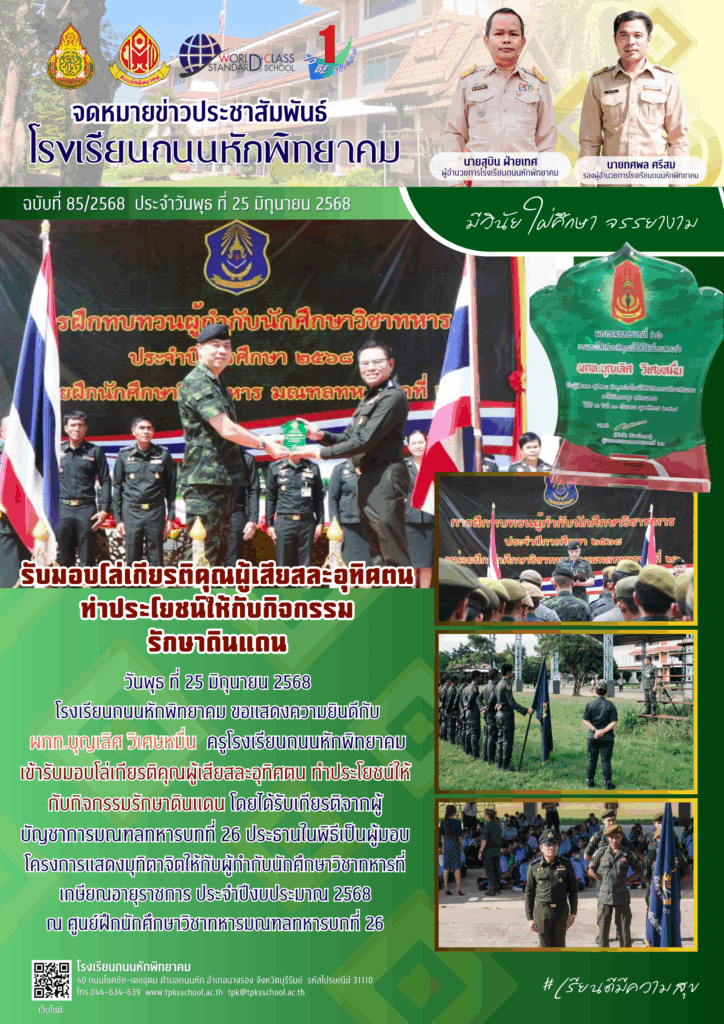 รับมอบโล่เกียรติคุณผู้เสียสละอุทิศตนทำประโยชน์ให้กับกิจกรรมรักษาดินแดนBy Sirinun S / July 3, 2025 วันพุธ ที่ 25 มิถุนายน 2568โรงเรียนถนนหักพิทยาคม ขอแสดงความยินดีกับผกท.บุญเลิศ วิเศษหมื่น ครูโรงเรียนถนนหักพิทยาคม เข้ารับมอบโล่เกียรติคุณผู้เสียสละอุทิศตน ทำประโยชน์ให้กับกิจกรรมรักษาดินแดน โดยได้รับเกียรติจากผู้บัญชาการมณฑลทหารบทที่ 26 ประธานในพิธีเป็นผู้มอบ โครงการแสดงมุทิตาจิตให้กับผู้กำกับนักศึกษาวิชาทหารที่เกษียณอายุราชการ ประจำปีงบประมาณ 2568 ณ ศูนย์ฝึกนักศึกษาวิชาทหารมณฑลทหารบกที่ 26📑 ข้อมูลโดย : กลุ่มบริหารงานบุคคล โรงเรียนถนนหักพิทยาคมข่าวสารโดย : งานประชาสัมพันธ์ 🖼️ รูปภาพเพิ่มเติม :