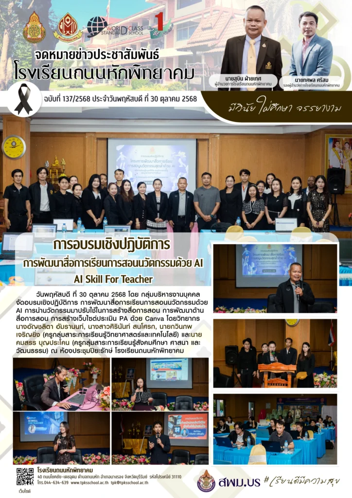 วันพฤหัสบดี ที่ 30 ตุลาคม 2568 โดย กลุ่มบริหารงานบุคคล จัดอบรมเชิงปฏิบัติการ การพัฒนาสื่อการเรียนการสอนนวัตกรรมด้วย AI การนำนวัตกรรมมาปรับใช้ในการสร้างสื่อการสอน การพัฒนาด้านสื่อการสอน การสร้างเว็บไซต์ประเมิน PA ด้วย Canva โดยวิทยากร นางอัญชลิตา อัมรานนท์, นางสาวศิรินันท์ สนโศรก, นายกวินภพ เจริญยิ่ง (ครูกลุ่มสาระการเรียนรู้วิทยาศาสตร์และเทคโนโลยี) และนายคมสรร บุญประโคน (ครูกลุ่มสาระการเรียนรู้สังคมศึกษา ศาสนา และวัฒนธรรม) ณ ห้องประชุมปิยะรักษ์ โรงเรียนถนนหักพิทยาคม