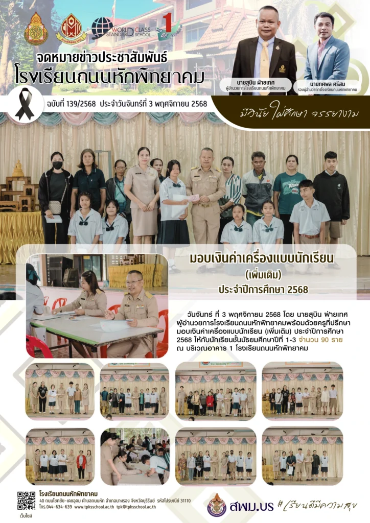 มอบเงินค่าเครื่องแบบนักเรียน (เพิ่มเติม) ประจำปีการศึกษา 2568By Sirinun S / November 10, 2025 วันจันทร์ ที่ 3 พฤศจิกายน 2568 โดย นายสุบิน ฝ่ายเทศ ผู้อำนวยการโรงเรียนถนนหักพิทยาคมพร้อมด้วยครูที่ปรึกษามอบเงินค่าเครื่องแบบนักเรียน (เพิ่มเติม) ประจำปีการศึกษา 2568 ให้กับนักเรียนชั้นมัธยมศึกษาปีที่ 1-3 จำนวน 90 ราย ณ บริเวณอาคาร 1 โรงเรียนถนนหักพิทยาค 📑 ข้อมูลโดย : กลุ่มบริหารงานงบประมาณ โรงเรียนถนนหักพิทยาคม ข่าวสารโดย : งานประชาสัมพันธ์ 🖼️ รูปภาพเพิ่มเติม :