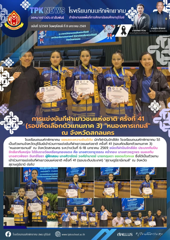 โรงเรียนถนนหักพิทยาคม ขอแสดงความยินดีกับ นักกีฬาปันจักสีลัต โรงเรียนถนนหักพิทยาคม ได้เป็นตัวแทนจังหวัดบุรีรัมย์เข้าร่วมการแข่งขันกีฬาเยาวชนแห่งชาติ ครั้งที่ 41 (รอบคัดเลือกตัวแทนภาค 3) “หนองหารเกมส์” ณ จังหวัดสกลนคร ระหว่างวันที่ 6-18 มกราคม 2569 ชนิดกีฬาปันจักสีลัต ประเภททีมปันจักลีลาทีมหญิง ได้รับรางวัลเหรียญทองแดง คือ นางสาวจารุวรรณ คร่ำทอง นางสาวชฎาพร แมลงทับ นางสาวพัชชา จันทร์โยธา ผู้ฝึกสอน นางศิวารัตน์ วงศ์อำมาตย์ นายกฤษดา ยอดแก้วทะเล ซึ่งได้เป็นตัวแทนเข้าร่วมการแข่งขันกีฬาเยาวชนแห่งชาติ ครั้งที่ 41 (รอบระดับประเทศ) “สุราษฎร์ธานีเกมส์” ณ จังหวัดสุราษฎร์ธานี ต่อไป