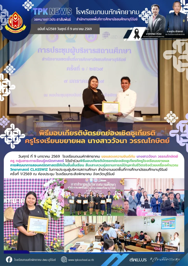 วันศุกร์ ที่ 9 มกราคม 2569 โรงเรียนถนนหักพิทยาคม ขอแสดงความยินดีกับ นางสาววัจนา วรรณโกษิตย์ ครู กลุ่มสาระการเรียนรู้คณิตศาสตร์ ได้เข้าร่วมพิธีมอบเกียรติบัตรยกย่องเชิดชูเกียรติครูโรงเรียนขยายผล การพัฒนาการสอนคณิตศาสตร์ให้เป็นชั้นชั้นเรียน สืบเสาะควบคู่สถานการณ์ปัญหาในชีวิตจริงด้วยเครื่องคำนวณวิทยาศาสตร์ CLASSWIZ ในการประชุมผู้บริหารสถานศึกษา สำนักงานเขตพื้นที่การศึกษามัธยมศึกษาบุรีรัมย์ครั้งที่ 1/2569 ณ ห้องประชุม โรงเรียนกระสังพิทยาคม จังหวัดบุรีรัมย์