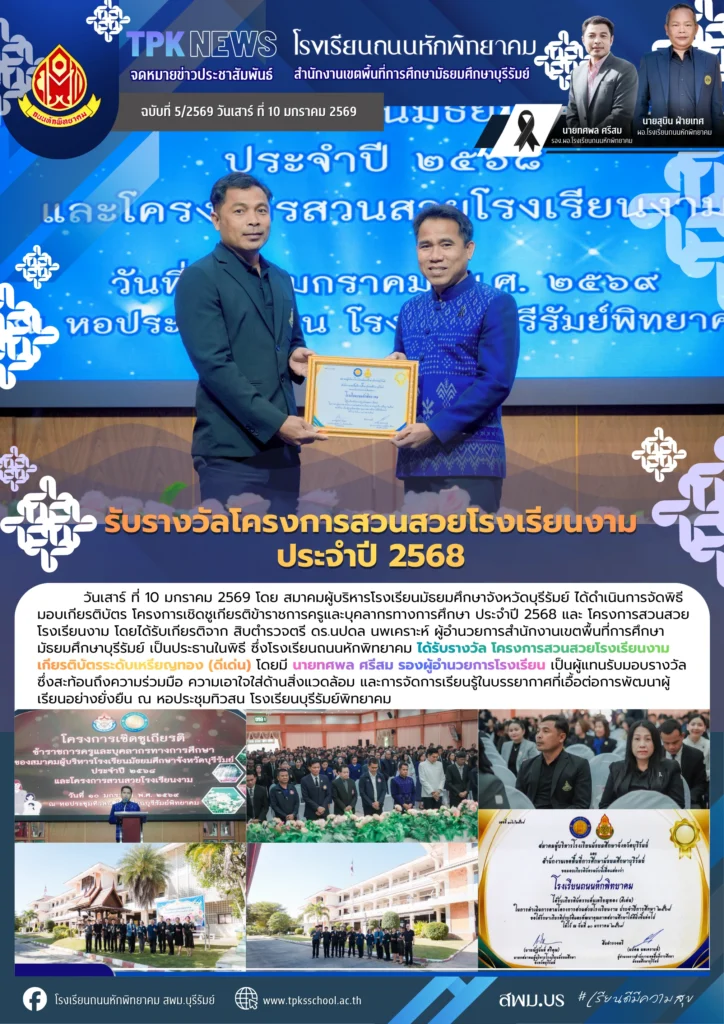 วันเสาร์ ที่ 10 มกราคม 2569 โดย สมาคมผู้บริหารโรงเรียนมัธยมศึกษาจังหวัดบุรีรัมย์ ได้ดำเนินการจัดพิธีมอบเกียรติบัตร โครงการเชิดชูเกียรติข้าราชการครูและบุคลากรทางการศึกษา ประจำปี 2568 และ โครงการสวนสวยโรงเรียนงาม โดยได้รับเกียรติจาก สิบตำรวจตรี ดร.นปดล นพเคราะห์ ผู้อำนวยการสำนักงานเขตพื้นที่การศึกษามัธยมศึกษาบุรีรัมย์ เป็นประธานในพิธี ซึ่งโรงเรียนถนนหักพิทยาคม ได้รับรางวัล โครงการสวนสวยโรงเรียนงาม เกียรติบัตรระดับเหรียญทอง (ดีเด่น) โดยมี นายทศพล ศรีสม รองผู้อำนวยการโรงเรียน เป็นผู้แทนรับมอบรางวัล ซึ่งสะท้อนถึงความร่วมมือ ความเอาใจใส่ด้านสิ่งแวดล้อม และการจัดการเรียนรู้ในบรรยากาศที่เอื้อต่อการพัฒนาผู้เรียนอย่างยั่งยืน ณ หอประชุมทิวสน โรงเรียนบุรีรัมย์พิทยาคม