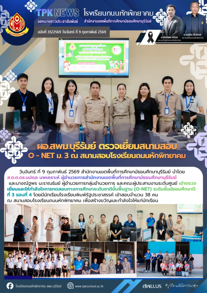 วันจันทร์ ที่ 9 กุมภาพันธ์ 2569 สำนักงานเขตพื้นที่การศึกษามัธยมศึกษาบุรีรัมย์ นำโดย ส.ต.ต.ดร.นปดล นพเคราะห์ ผู้อำนวยการสำนักงานเขตพื้นที่การศึกษามัธยมศึกษาบุรีรัมย์และนางณัฐพร นะราณรัมย์ ผู้อำนวยการกลุ่มอำนวยการ และคณะผู้ประสานงานระดับศูนย์ เข้าตรวจเยี่ยมและให้กำลังใจการทดสอบทางการศึกษาระดับชาติขั้นพื้นฐาน (O-NET) ระดับชั้นมัธยมศึกษาปีที่ 3 รอบที่ 4 โดยมีนักเรียนโรงเรียนพิมพ์รัฐประชาสรรค์ เข้าสอบจำนวน 38 คน ณ สนามสอบโรงเรียนถนนหักพิทยาคม เพื่อสร้างขวัญและกำลังใจให้แก่นักเรียน