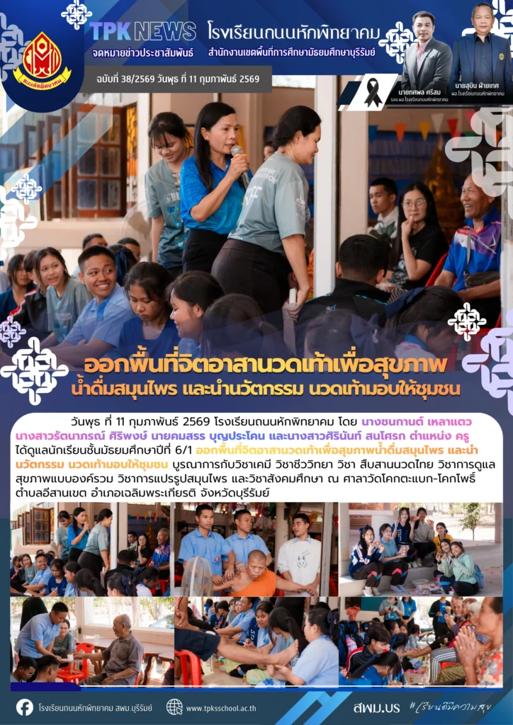 วันพุธ ที่ 11 กุมภาพันธ์ 2569 โรงเรียนถนนหักพิทยาคม โดย นางชนกานต์ เหลาแตว นางสาวรัตนาภรณ์ ศิริพงษ์ นายคมสรร บุญประโคน และนางสาวศิรินันท์ สนโศรก ตำแหน่ง ครู ได้ดูแลนักเรียนชั้นมัธยมศึกษาปีที่ 6/1 ออกพื้นที่จิตอาสานวดเท้าเพื่อสุขภาพน้ำดื่มสมุนไพร และนำนวัตกรรม นวดเท้ามอบให้ชุมชน บูรณาการกับวิชาเคมี วิชาชีววิทยา วิชา สืบสานนวดไทย วิชาการดูแลสุขภาพแบบองค์รวม วิชาการแปรรูปสมุนไพร และวิชาสังคมศึกษา ณ ศาลาวัดโคกตะแบก-โคกโพธิ์ ตำบลอีสานเขต อำเภอเฉลิมพระเกียรติ จังหวัดบุรีรัมย์