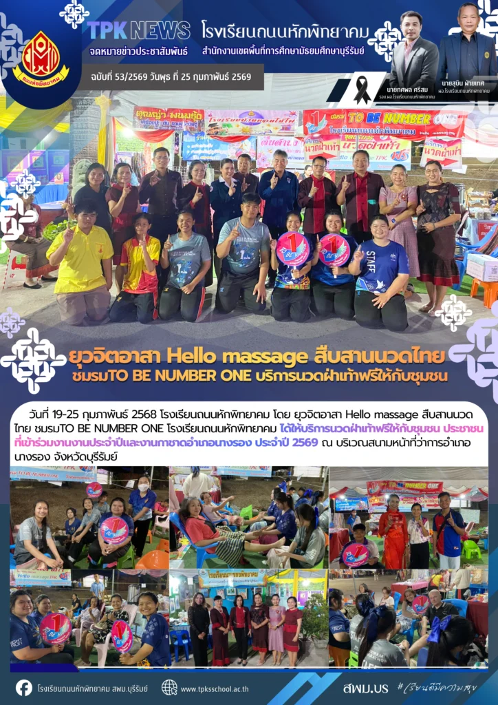 ยุวจิตอาสา Hello massage สืบสานนวดไทย ชมรมTO BE NUMBER ONE บริการนวดฝ่าเท้าฟรีให้กับชุมชนBy Sirinun S / March 5, 2026 วันที่ 19-25 กุมภาพันธ์ 2568 โรงเรียนถนนหักพิทยาคม โดย ยุวจิตอาสา Hello massage สืบสานนวดไทย ชมรมTO BE NUMBER ONE โรงเรียนถนนหักพิทยาคม ได้ให้บริการนวดฝ่าเท้าฟรีให้กับชุมชน ประชาชนที่เข้าร่วมงานงานประจำปีและงานกาชาดอำเภอนางรอง ประจำปี 2569 ณ บริเวณสนามหน้าที่ว่าการอำเภอนางรอง จังหวัดบุรีรัมย์📑 ข้อมูลโดย : ชมรม TO BE NUMBER ONE โรงเรียนถนนหักพิทยาคมข่าวสารโดย : งานประชาสัมพันธ์ 🖼️ รูปภาพเพิ่มเติม :