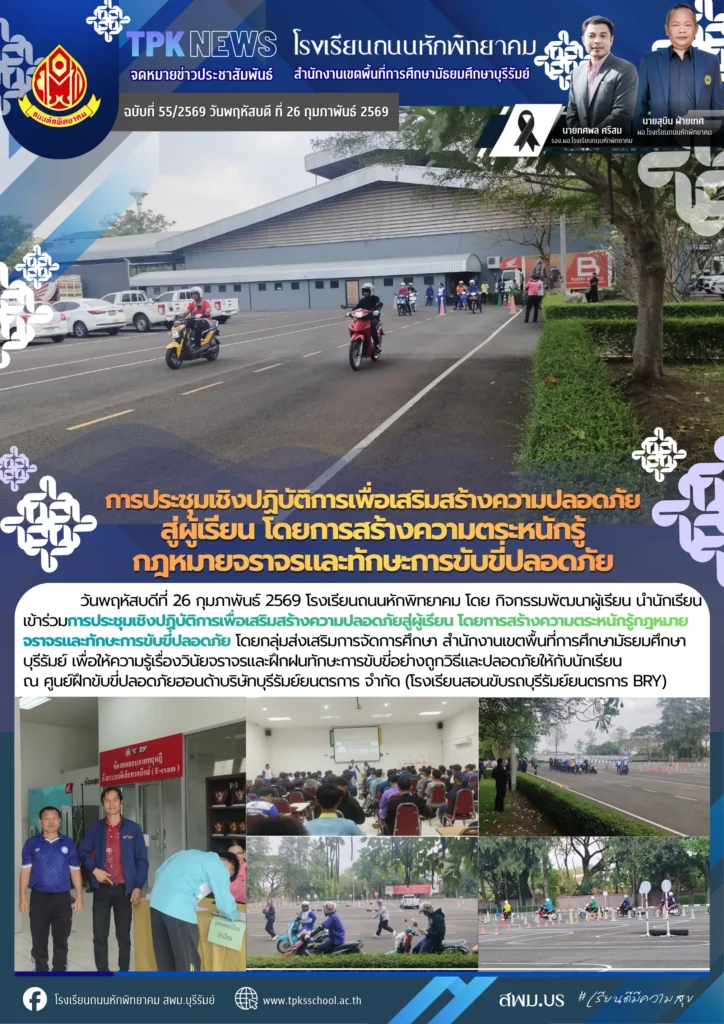 วันพฤหัสบดีที่ 26 กุมภาพันธ์ 2569 โรงเรียนถนนหักพิทยาคม โดย กิจกรรมพัฒนาผู้เรียน นำนักเรียนเข้าร่วมการประชุมเชิงปฏิบัติการเพื่อเสริมสร้างความปลอดภัยสู่ผู้เรียน โดยการสร้างความตระหนักรู้กฎหมายจราจรและทักษะการขับขี่ปลอดภัย โดยกลุ่มส่งเสริมการจัดการศึกษา สำนักงานเขตพื้นที่การศึกษามัธยมศึกษาบุรีรัมย์ เพื่อให้ความรู้เรื่องวินัยจราจรและฝึกฝนทักษะการขับขี่อย่างถูกวิธีและปลอดภัยให้กับนักเรียน ณ ศูนย์ฝึกขับขี่ปลอดภัยฮอนด้าบริษัทบุรีรัมย์ยนตรการ จำกัด (โรงเรียนสอนขับรถบุรีรัมย์ยนตรการ BRY)