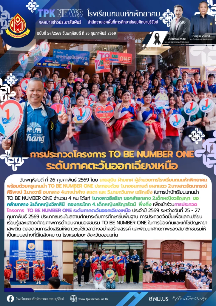 วันพฤหัสบดี ที่ 26 กุมภาพันธ์ 2569 โดย นายสุบิน ฝ่ายเทศ ผู้อำนวยการโรงเรียนถนนหักพิทยาคม พร้อมด้วยครูแกนนำ TO BE NUMBER ONE ประกอบด้วย 1.นางชนกานต์ เหลาแตว 2.นางสาวรัตนาภรณ์ ศิริพงษ์ 3.นางวารี อบกลาง 4.นางน้ำค้าง สะเดา และ 5.นายกวินภพ เจริญยิ่ง ในการนำนักเรียนแกนนำ TO BE NUMBER ONE จำนวน 4 คน ได้แก่ 1.นางสาวอิสริยา ขอคล้ายกลาง 2.เด็กหญิงวรัญญา ขอคล้ายกลาง 3.เด็กหญิงวิลาสินี ถองกระโทก 4. เด็กหญิงสริญารัตน์ พึ่งกิ่ง เพื่อเข้าร่วมการประกวดโครงการ TO BE NUMBER ONE ระดับภาคตะวันออกเฉียงเหนือ ประจำปี 2569 ระหว่างวันที่ 25 – 27 กุมภาพันธ์ 2569 ประเภทชมรมในสถานศึกษาระดับการศึกษาขั้นพื้นฐาน การประกวดจัดขึ้นเพื่อแลกเปลี่ยนเรียนรู้และแสดงศักยภาพการดำเนินงานของชมรม TO BE NUMBER ONE ในการป้องกันและแก้ไขปัญหายาเสพติด ตลอดจนการส่งเสริมให้เยาวชนใช้เวลาว่างอย่างสร้างสรรค์ และพัฒนาศักยภาพของสมาชิกชมรมให้เป็นแบบอย่างที่ดีในสังคม ณ โรงแรมโฆษะ จังหวัดขอนแก่น