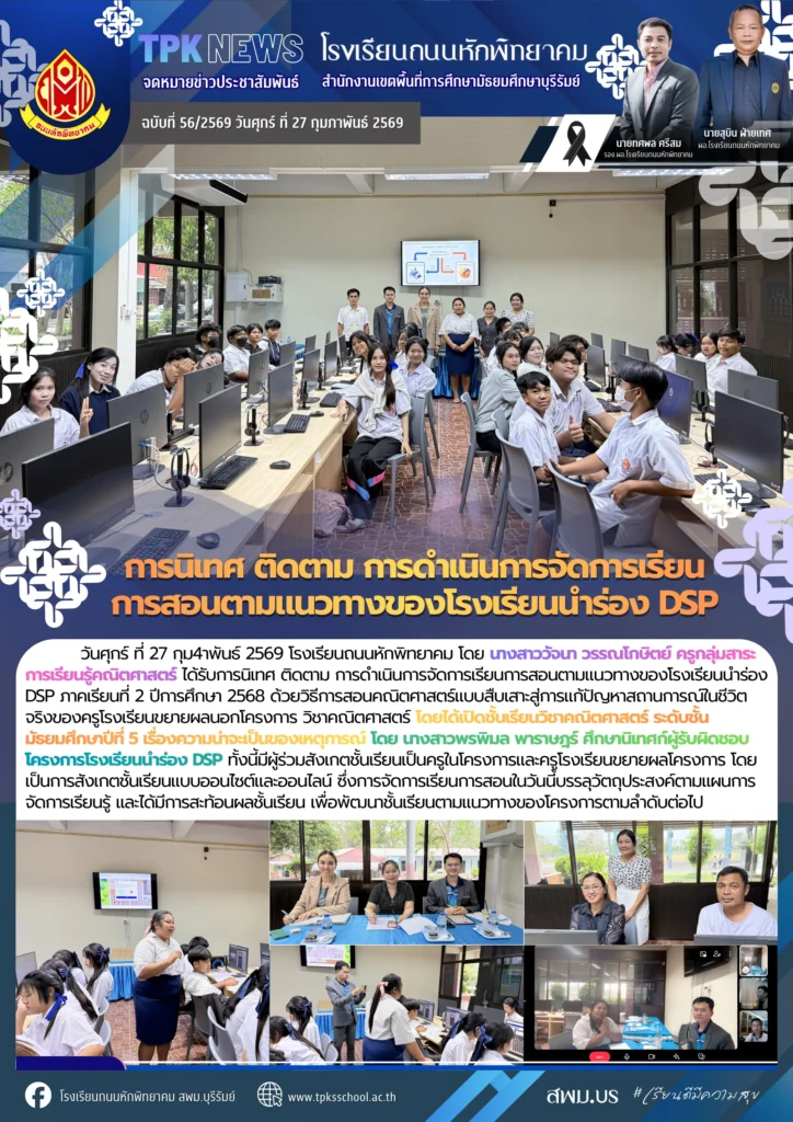 วันศุกร์ ที่ 27 กุม4าพันธ์ 2569 โรงเรียนถนนหักพิทยาคม โดย นางสาววัจนา วรรณโกษิตย์ ครูกลุ่มสาระการเรียนรู้คณิตศาสตร์ ได้รับการนิเทศ ติดตาม การดำเนินการจัดการเรียนการสอนตามแนวทางของโรงเรียนนำร่อง DSP ภาคเรียนที่ 2 ปีการศึกษา 2568 ด้วยวิธีการสอนคณิตศาสตร์แบบสืบเสาะสู่การแก้ปัญหาสถานการณ์ในชีวิตจริงของครูโรงเรียนขยายผลนอกโครงการ วิชาคณิตศาสตร์ โดยได้เปิดชั้นเรียนวิชาคณิตศาสตร์ ระดับชั้นมัธยมศึกษาปีที่ 5 เรื่องความน่าจะเป็นของเหตุการณ์ โดย นางสาวพรพิมล พาราษฎร์ ศึกษานิเทศก์ผู้รับผิดชอบโครงการโรงเรียนนำร่อง DSP ทั้งนี้มีผู้ร่วมสังเกตชั้นเรียนเป็นครูในโครงการและครูโรงเรียนขยายผลโครงการ โดยเป็นการสังเกตชั้นเรียนแบบออนไซต์และออนไลน์ ซึ่งการจัดการเรียนการสอนในวันนี้บรรลุวัตถุประสงค์ตามแผนการจัดการเรียนรู้ และได้มีการสะท้อนผลชั้นเรียน เพื่อพัฒนาชั้นเรียนตามแนวทางของโครงการตามลำดับต่อไป