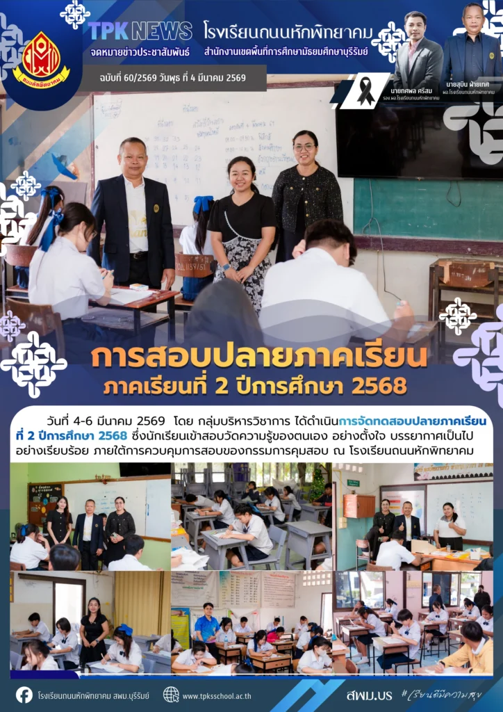 การสอบปลายภาคเรียน ภาคเรียนที่ 2 ปีการศึกษา 2568By Sirinun S / March 5, 2026 วันที่ 4-6 มีนาคม 2569 โดย กลุ่มบริหารวิชาการ ได้ดำเนินการจัดทดสอบปลายภาคเรียนที่ 2 ปีการศึกษา 2568 ซึ่งนักเรียนเข้าสอบวัดความรู้ของตนเอง อย่างตั้งใจ บรรยากาศเป็นไปอย่างเรียบร้อย ภายใต้การควบคุมการสอบของกรรมการคุมสอบ ณ โรงเรียนถนนหักพิทยาคม📑 ข้อมูลโดย : กลุ่มบริหารวิชาการ โรงเรียนถนนหักพิทยาคมข่าวสารโดย : งานประชาสัมพันธ์ 🖼️ รูปภาพเพิ่มเติม :